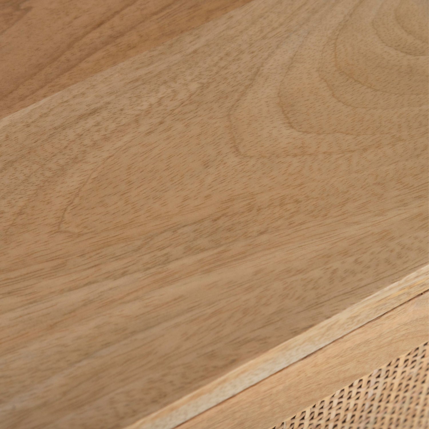 This 2-door buffet is a furniture marvel that displays visually appealing natural aesthetics. It is a versatile storage case that looks lovely in the living room and kitchen. Made of sustainably harvested mango wood, the furniture piece has gorgeous rattan weave on the door fronts. Mango wood is valued for its robustness, longevity, and resistance to mould or moisture. Adjustable hinges, magnetic latches, and solid brass metal handles add to the practical functionality of the doors that cover sizable compartments. Attractive tapered legs made of solid timber provide a sturdy base for the buffet. Designed in a contemporary style, the furniture piece brings a sense of cosiness and warmth to your living area. The natural colour makes it suitable to complement diverse interior decor styles or furniture pieces. The easy-to-assemble buffet comes with a one-year warranty.