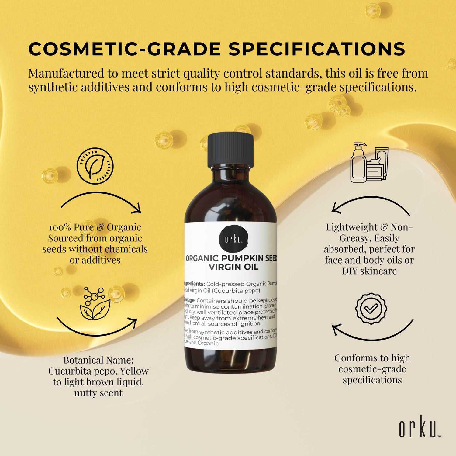 Orku Organic Pumpkin Seed Virgin Oil is a cold-pressed, 100% pure oil derived from the seeds of Cucurbita pepo. Known for its rich composition of essential fatty acids and mild, natural aroma, this oil is ideal for use in cosmetic and personal care formulations.