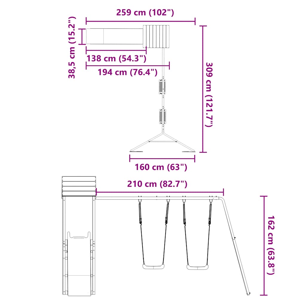 Do you want to give your children the freedom to play at home? This wooden outdoor playset transforms your backyard into a playground for imaginative adventures! Durable material: This climbing frame with slide is made of solid douglas wood. Solid douglas wood is a highly durable wood that works well for outdoors. Douglas wood is also strong enough to work with minimum care, even under the influence of the weather. Sturdy and stable frame: The wooden frame of the garden climbing frame ensures sturdiness and stability. In addition, the "A" shaped legs of the children's swing allow for balance.Multi-activity centres: The climbing frame features a 90 cm height platform and stands out with its wave slide, a double swing set as well as a sandpit. Your little ones can also invite their friends to join the fun. Thoughtful design: The wooden roof provides shade for your children on hot summer days. Endless fun: This fun-filled wooden outdoor playhouse is the perfect way for your children and their friends to enjoy entertainment, have more interactive time and make memories for you and your children! Warning:Only for domestic useOutdoor use Not suitable for children under 3 years Recommend user age: 3-8 years old Good to know:To make assembly as easy as possible, each product is delivered with a manual.