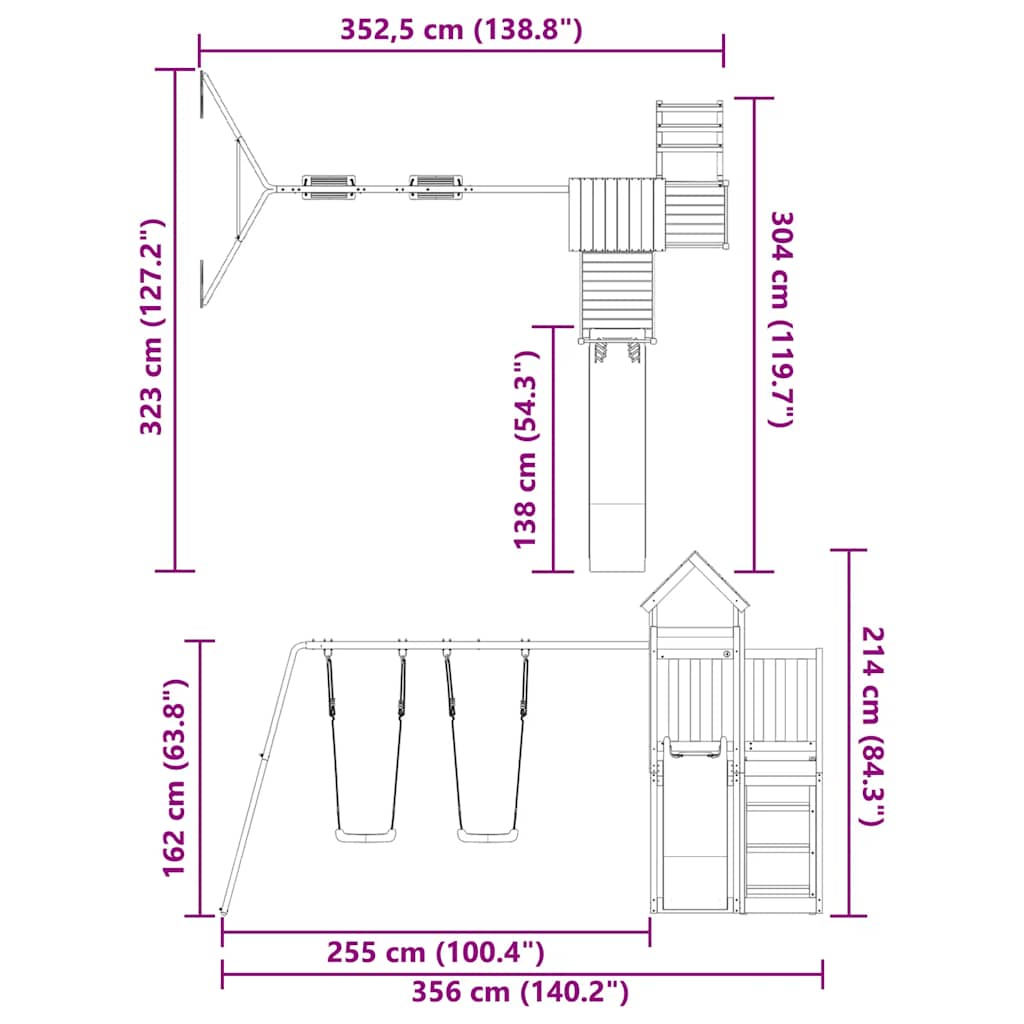 Do you want to give your children the freedom to play at home? This wooden outdoor playset transforms your backyard into a playground for imaginative adventures! Durable material: This playhouse is made of solid pine wood. Solid pine wood is a beautiful natural material. Pine wood has a straight grain, and the knots give the material its signature, rustic look.Sturdy and stable frame: The wooden frame ensures sturdiness and stability. In addition, the "A" shaped legs of the children's swing allow for balance. Multi-activity centres: The climbing frame features a 90 cm height platform and stands out with its wave slide, a ladder, a double swing set as well as sandpits. Your little ones can also invite their friends to join the fun. Thoughtful design: The surrounding wooden railings are designed to ensure the safety of children during their happy play. Also, the wooden roof provides shade for your children on hot summer days.Endless fun: This fun-filled wooden outdoor playhouse is the perfect way for your child and their friends to enjoy entertainment, have more interactive time and make memories for you and your children! Warning:Only for domestic useOutdoor use Not suitable for children under 3 years Recommend user age: 3-8 years old Good to know:To make assembly as easy as possible, each product is delivered with a manual.