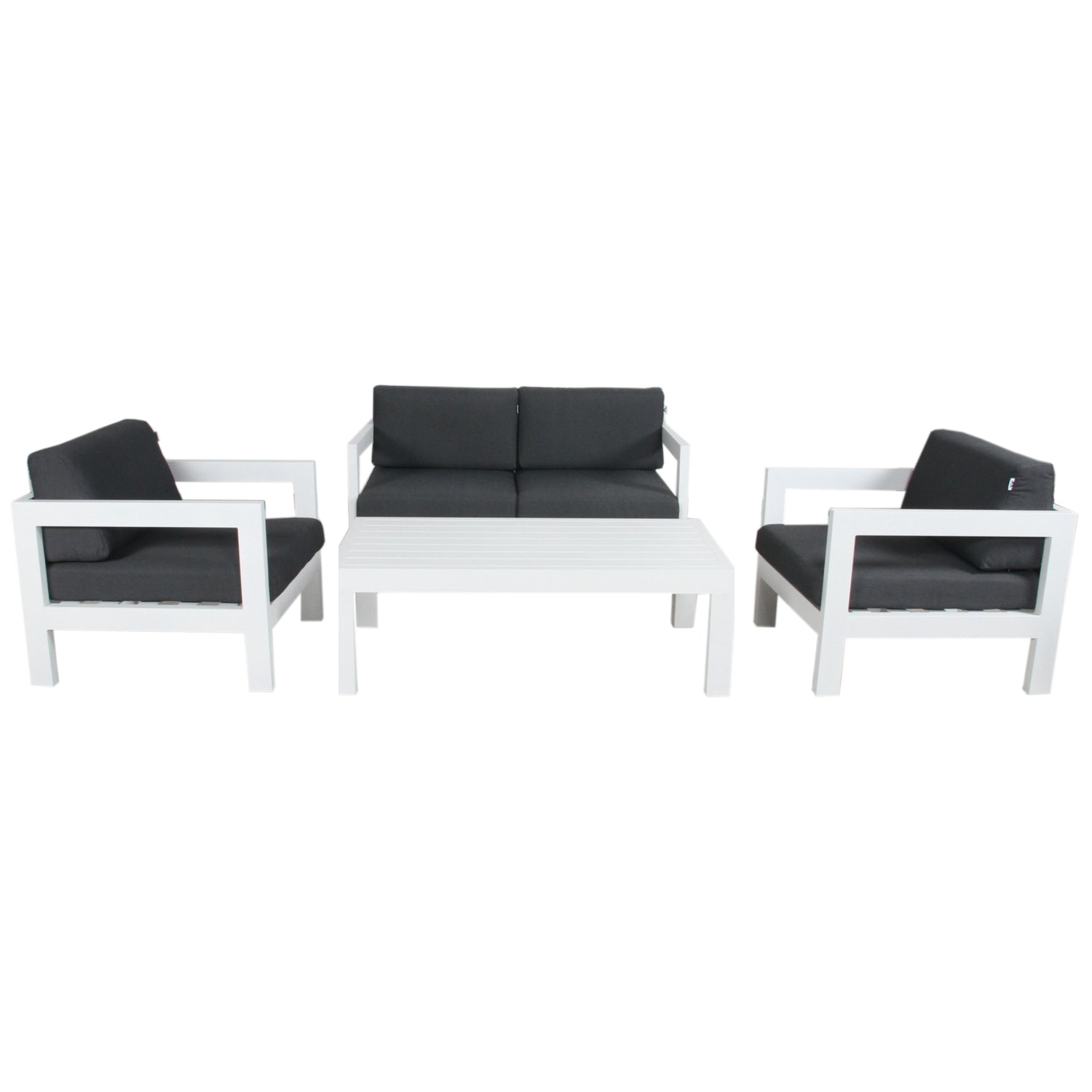 This smart combination of a 2+1+1 seater sofas and coffee table set makes dining in outdoor areas trouble-free. Suitable for medium- to large-sized outdoor areas, the set, designed in contemporary coastal style, showcases amazing craftsmanship. The sofas ensure complete relaxation when you sit or stretch on them. They offer wide and deep seating for superior lounge comfort. Weatherproof, water-repellent, and UV-protected cushions make them ideal for outdoor dining areas. The accompanying coffee table is equally beautiful. The aesthetically crafted coffee table has an aluminium slat tabletop that looks nice in an outdoor setting. The structural frame of the outdoor set is made of durable, powder-coated, non-rusting aluminium and 100% polyester fabric upholstery. The white frame with dark grey fabric looks beautiful in the outdoor setting. The set is durable as well. The frame comes with a two-year warranty, while the fabric and foam come with a one-year warranty.
