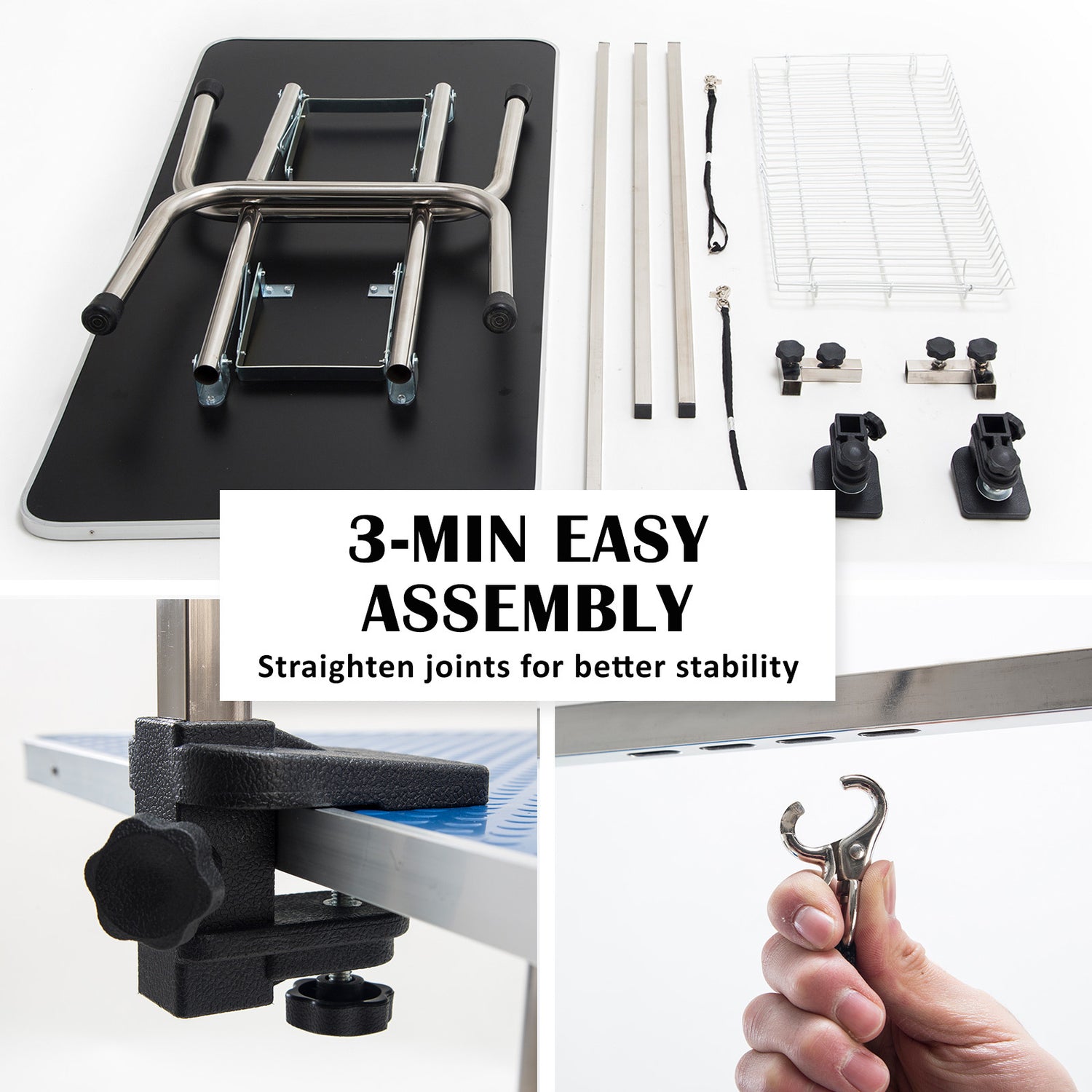 The board is made of high-quality easy clean vinyl textured surface which is also scratch and slip-proof so it is safe for your pet as they are able to stand stably. The edges of the table are rounded for safety in case you or small children hit the corner of the table. The table comes with a clamp on height-adjustable grooming H-frame with 2 security nylon grooming loops so your pet can stay in a comfortable position while you work on it. The table frame is made of high-quality durable stainless steel and the legs come with anti-slip rubber in order to add stability to the table. There is also a convenient basket under the table to store tools in order to make grooming more convenient.