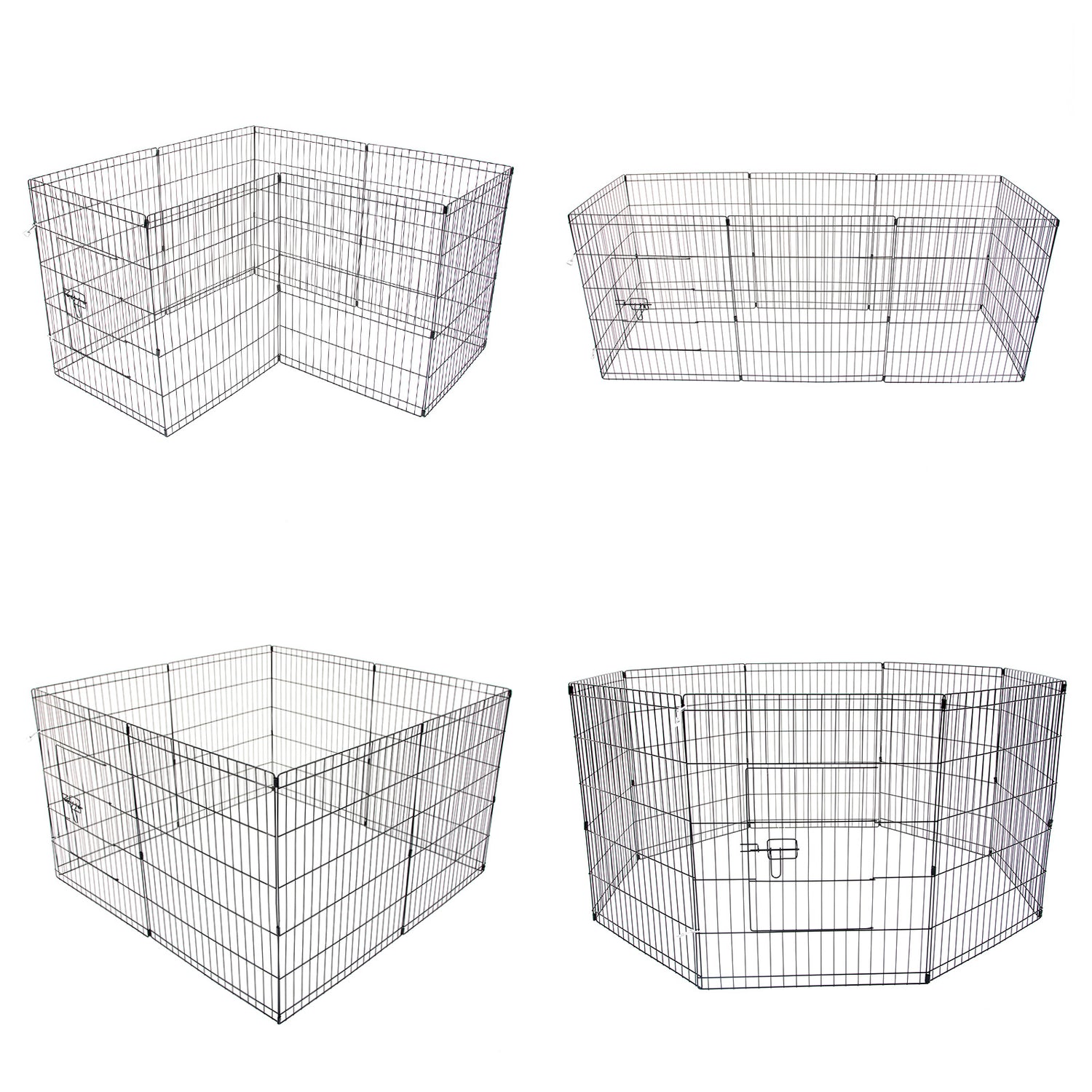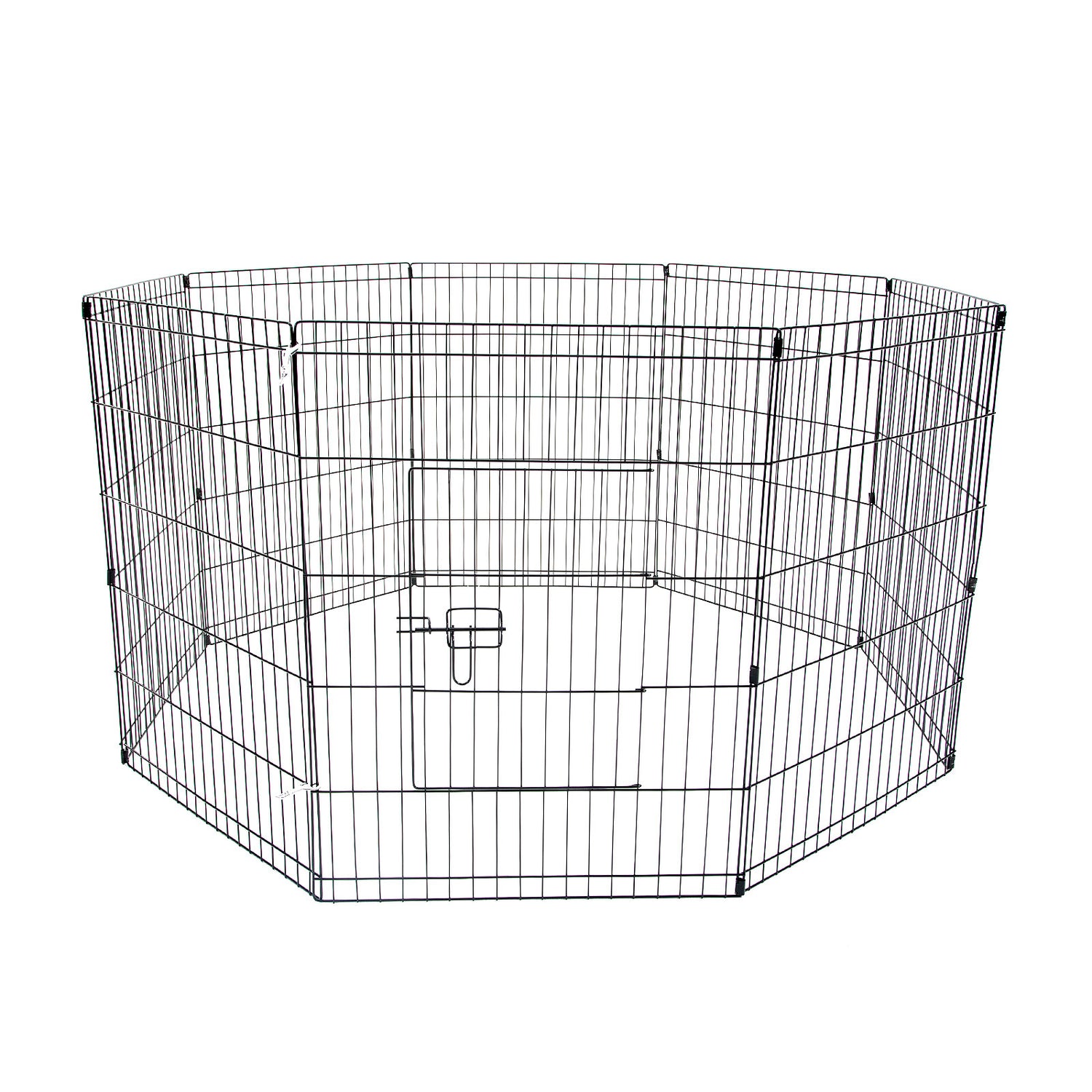 It features as 8 panels for multi-configuration which allows you to turn your playpen into different shapes. Made of durable steel frames construction with black powder coat finish provides Long Lasting Protection and weather resistance. The access door with bolt latches you can be sure that your pet doesn't have the opportunity to run away and the round edges ensure pet safety.