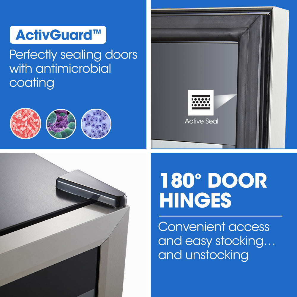 Its stylish Euro design fits any decor, has fingerprint resistant Aero Silver finish. The Ghost Mirrored Glass looks great and prevents UV and infrared light from damaging your wine. The double paned glass door provides superior insulation. The Acier Plus looks great on a bartop, freestanding or under your countertop.