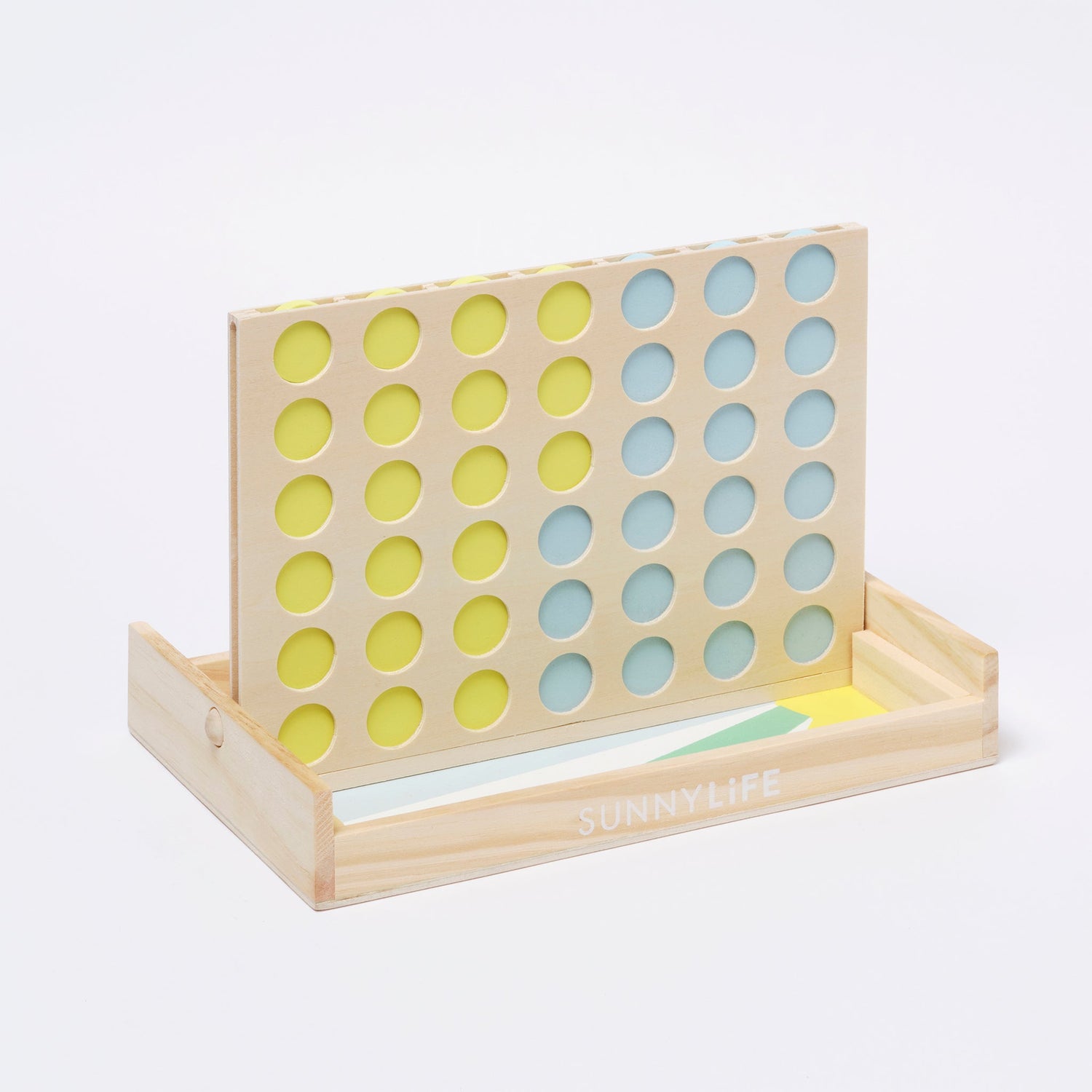Take Me Anywhere! Transforming into its own wooden carry case, this travel-size mini is made for adventures. Get back to basics with a classic game set made from natural wood. Featuring a bold sunburst interior print and a confectionary colour scheme, the Pastel Gelato mini 4-in-a-row set is made for playing the day away in style, no matter where life takes you.