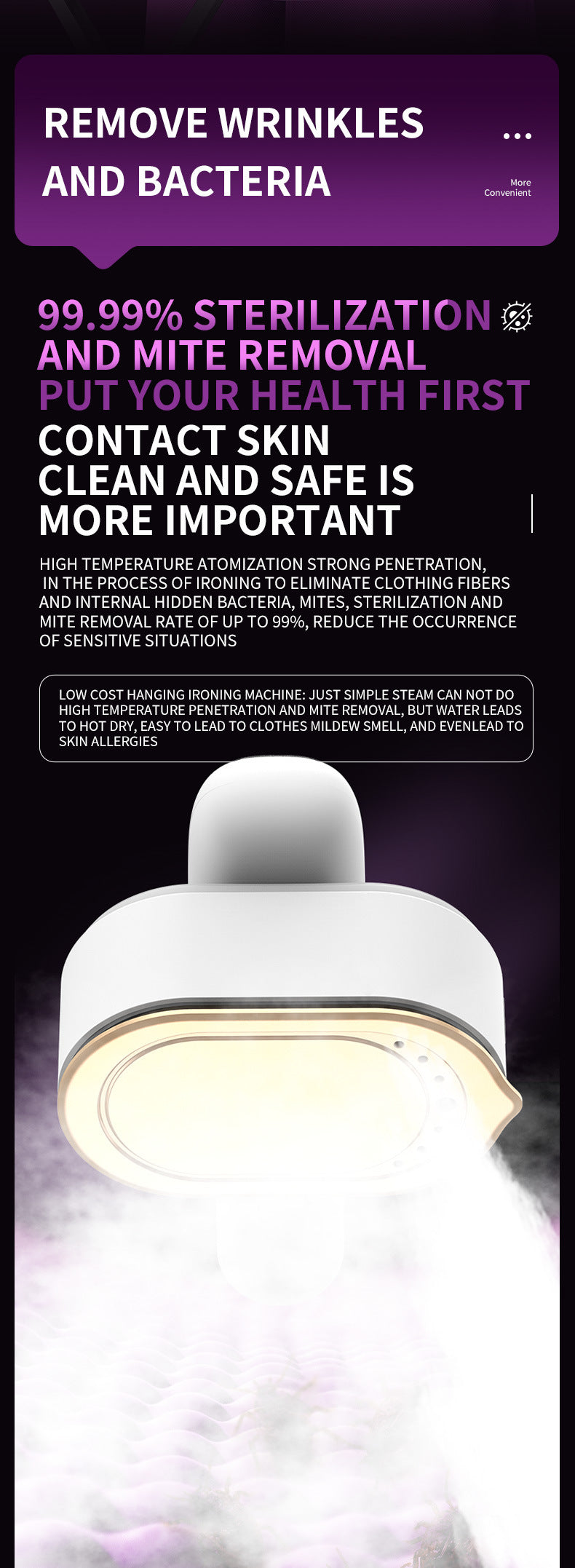 - Bacteria & Mite Reduction: Steam effectively reduces bacterial growth and mites, promoting garment hygiene.