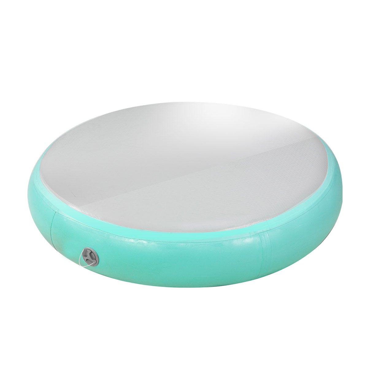 The Powertrain round gymnastics mat also comes with a foot pump for quick inflation and deflation. After use, simply deflate the mat, roll it up, and store it away.