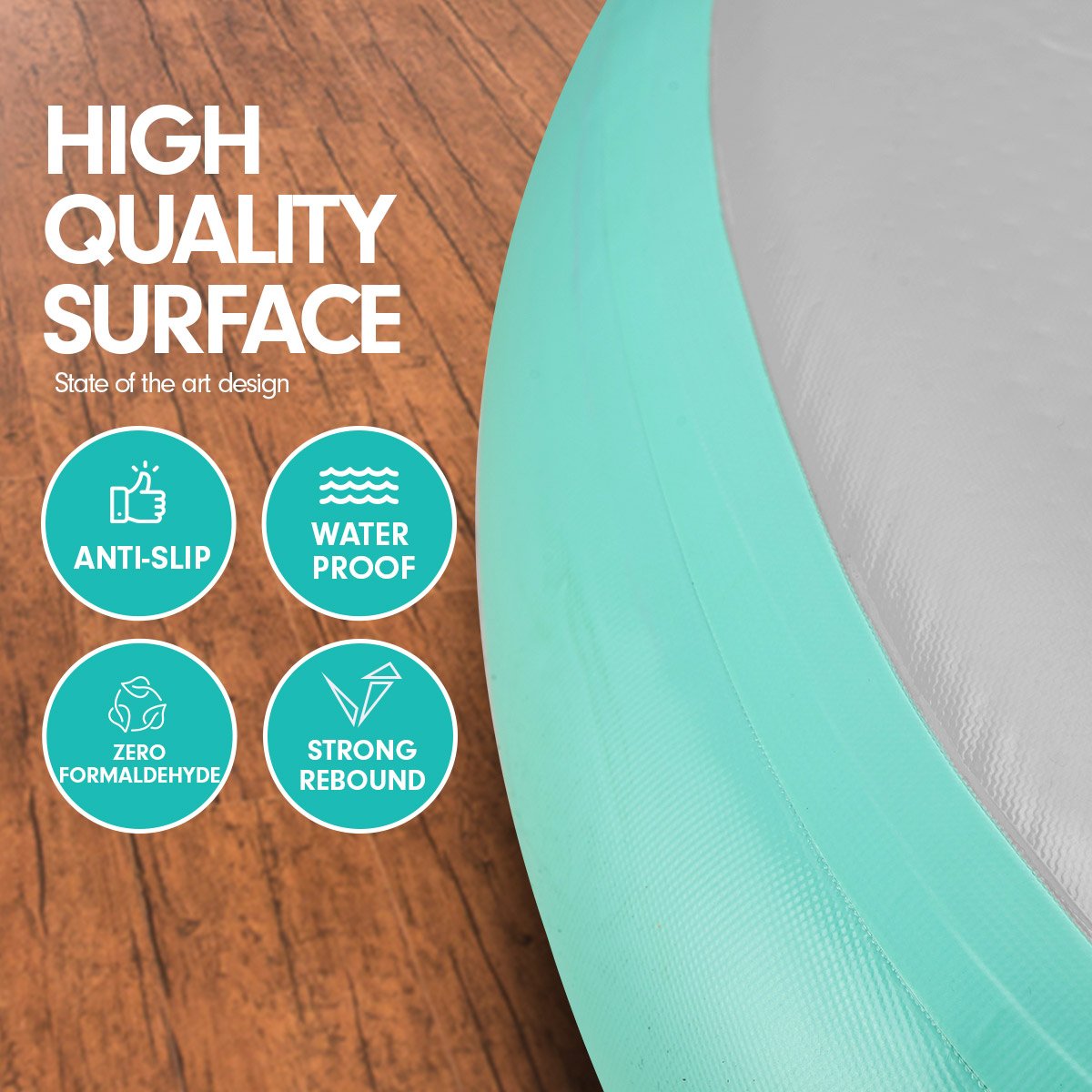 This 1m inflatable tumbling mat is 20cm thick, which makes it easy on the body at low impact but comes close to a spring floor at higher pressures. It is also incredibly lightweight, so you can easily roll and move it around even when its fully inflated.