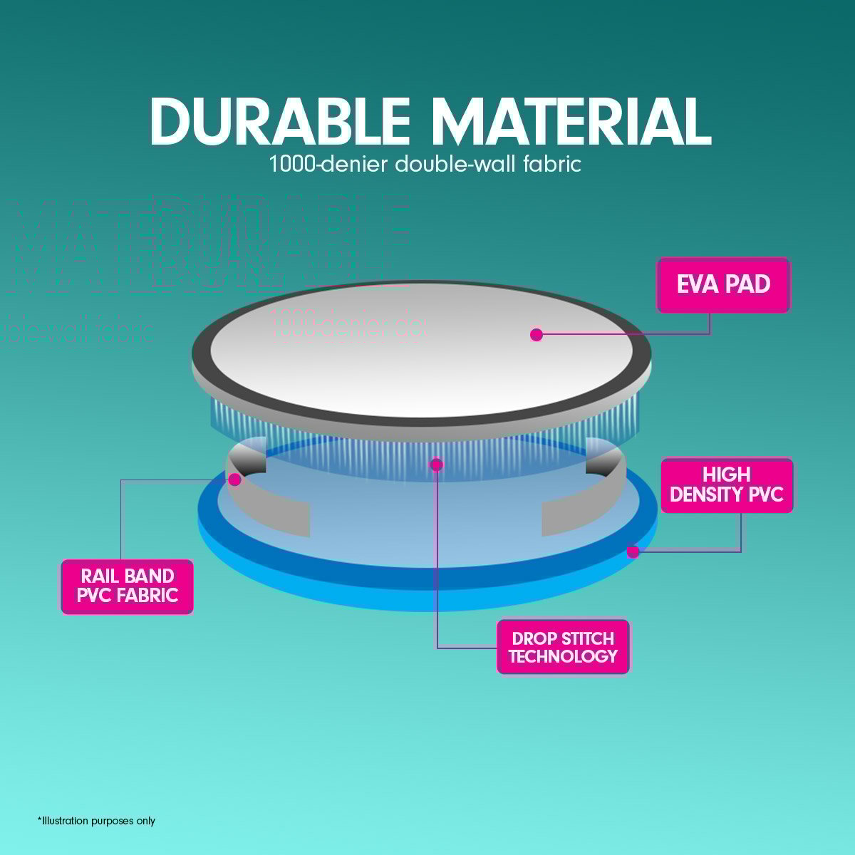 Its made of double-wall fabric (also known as drop-stitch material) and a 1.2mm thick PVC tarpaulin that ensures airtightness and durability. The top surface is composed of rubber-like EVA that prevents slipping and provides a high rebound.
