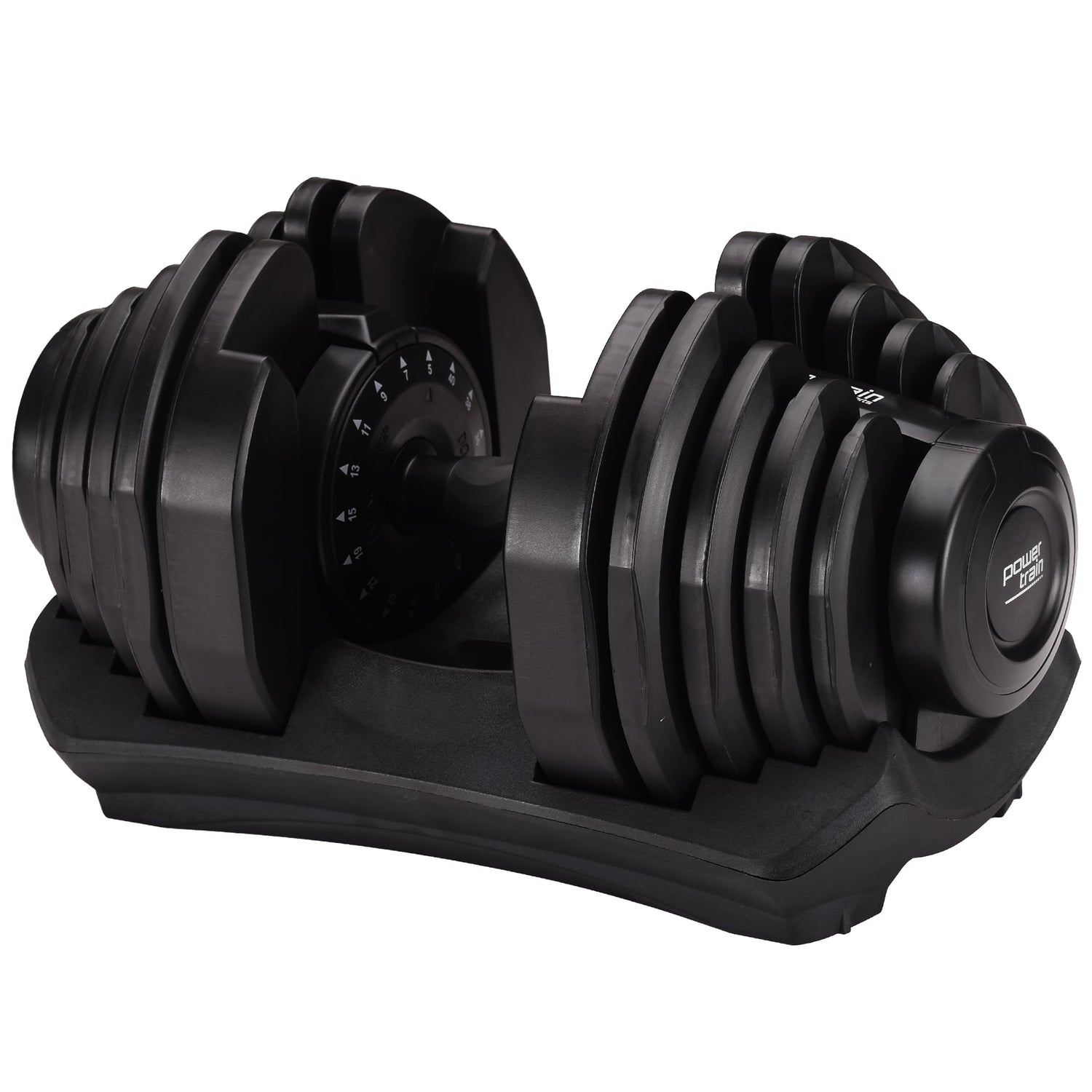 The Powertrain Adjustable Dumbbell's ergonomic design makes it the most space-efficient and flexible strength-training option available. With just the turn of a dial, you can automatically change your resistance on this dumbbell from 10 pounds all the way up to 90 pounds!