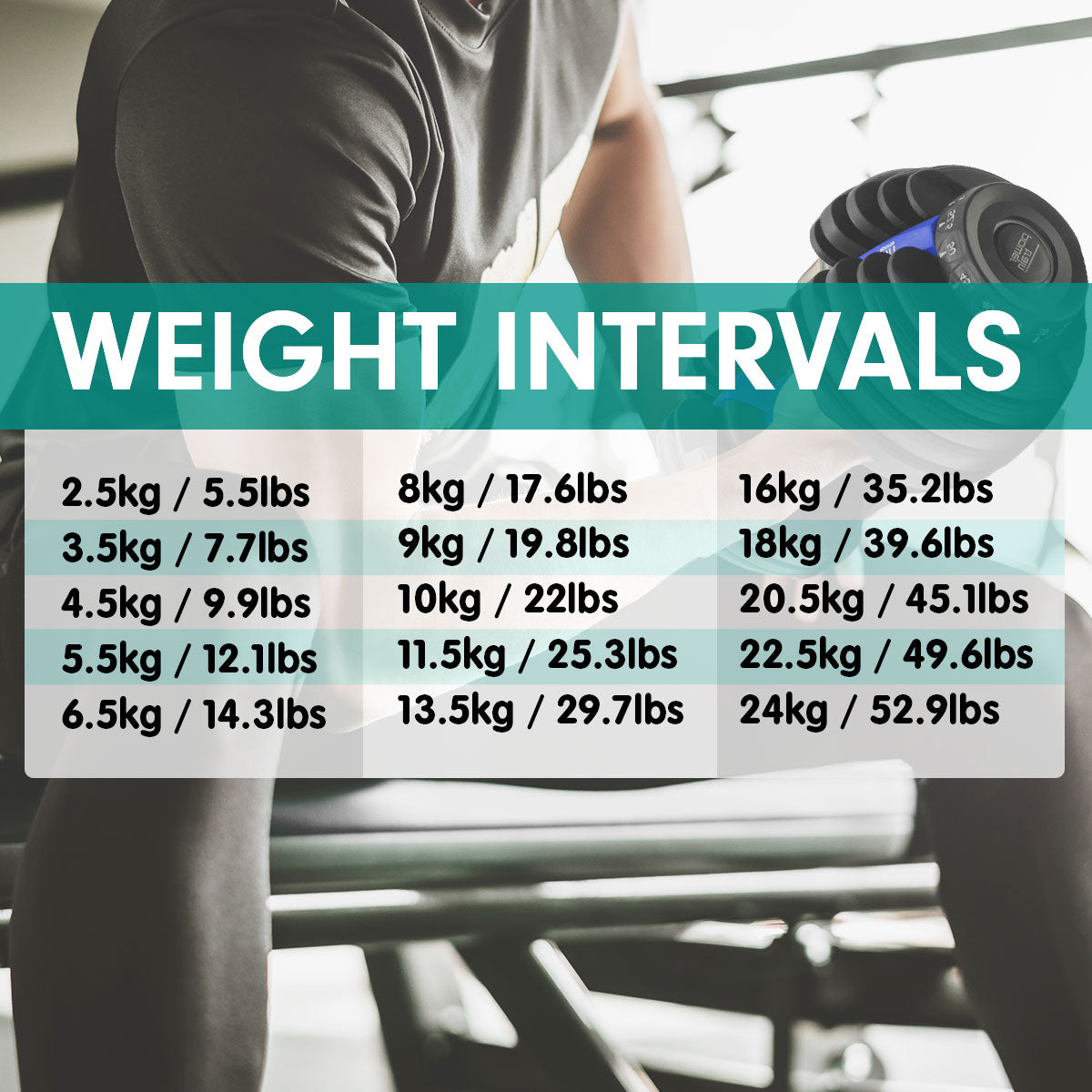 - Weight range: 5-52.5lb (2.3-24kg) each