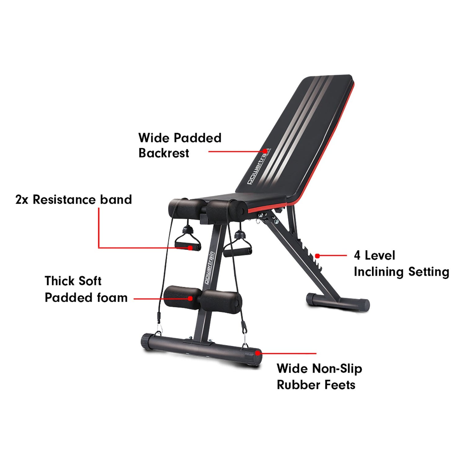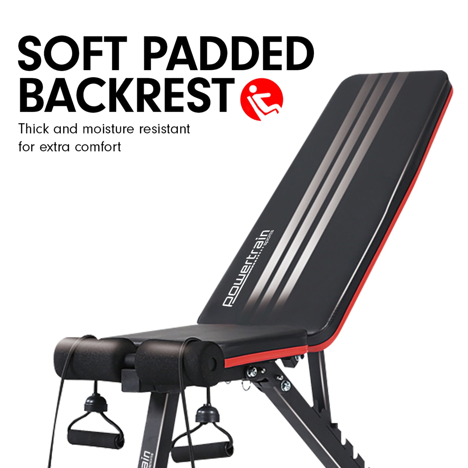 The Powertrain adjustable bench is just what you need to sit and do dumbbell arm curls and leg extensions, as well as being an incline-flat-decline bench press with a total load rating of 150kg.