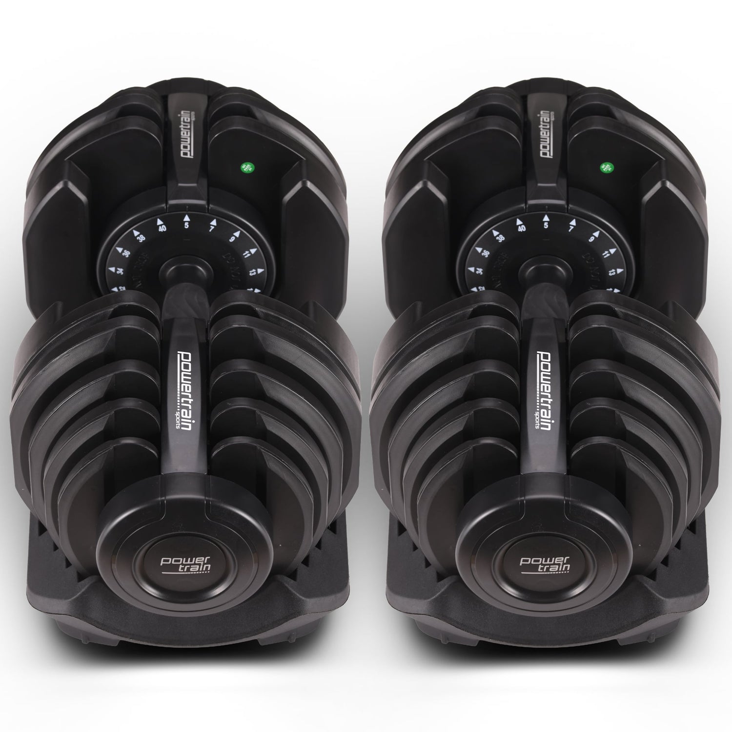 The PowerTrain Adjustable Dumbbell set's ergonomic design makes it the most space-efficient and flexible strength-training option available. With just the turn of a dial, you can automatically change your resistance on each dumbbell from 10 pounds all the way up to 90 pounds each.