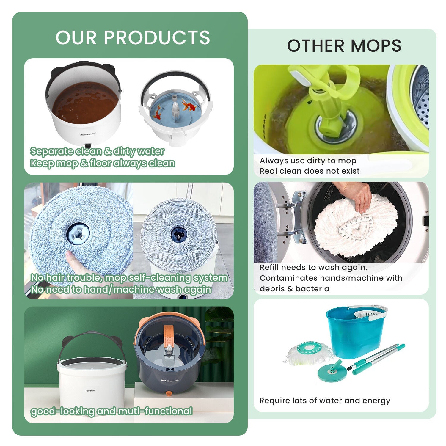 - Washes dries like magic: Push-spin system automatically separates clean and dirty water while rinsing your mop — no hand contact, ever.