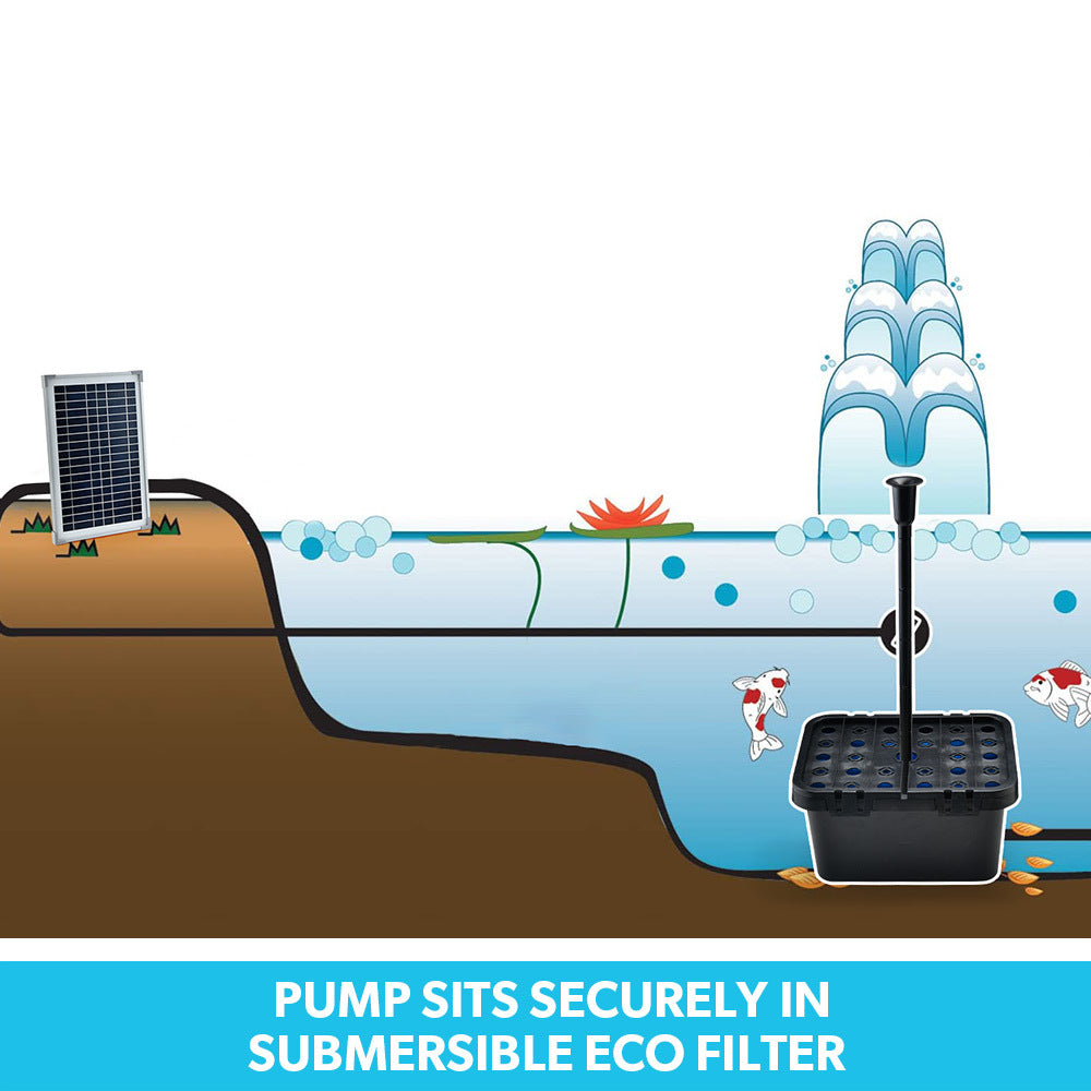The pump sits securely in the innovative filter box that has a chamber for biochemical balls that together promote the growth of beneficial bacteria, while at the same time cleaning your pond of harmful bacteria such as ammonia and nitrate. The 2 stage filtration system extends the life of your pump by preventing any debris from entering the unit.