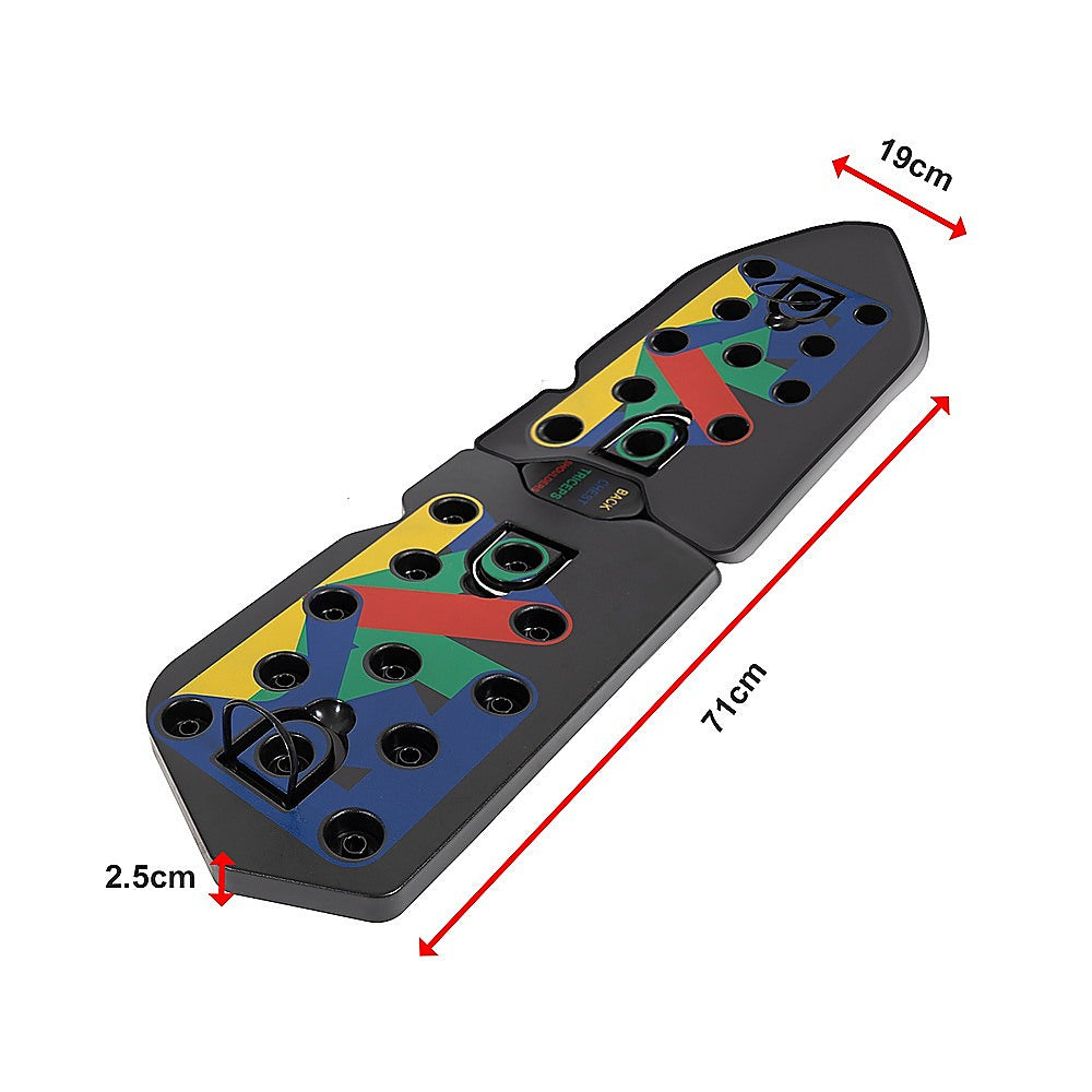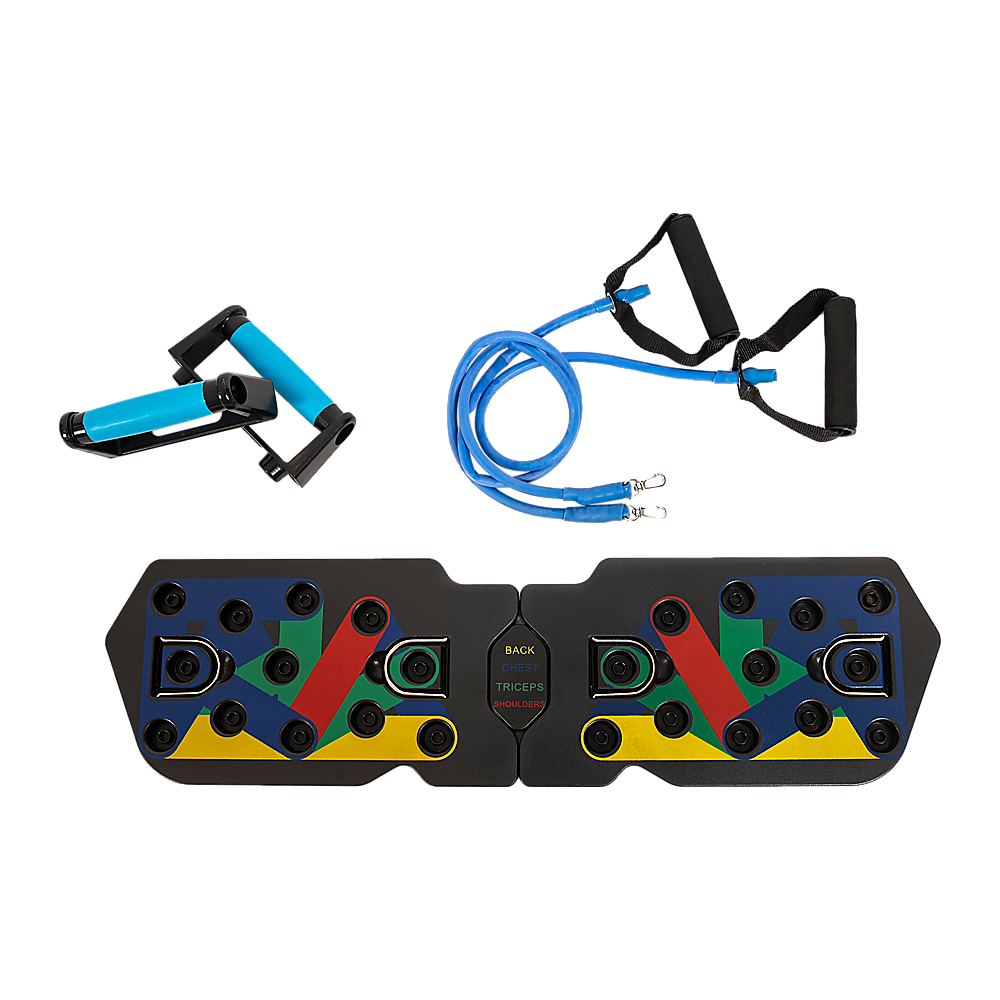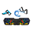 Experience the advance and enhanced 13-in-1 push up bars with resistance bands. Designed for sculpting and maximizing chest, buttocks, shoulders, back, and triceps. Each colour targets specific muscles: blue for chest, red for shoulders, yellow for the back, and green for triceps.