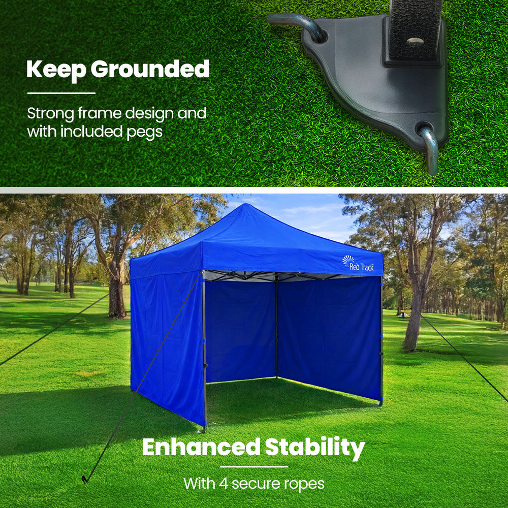 RED TRACK 3x3m Premium Pop Up Gazebo Marquee, Patented Steel Cable Canopy Support System, Wheeled Carry Bag, Side Walls, UV Block, Reinforced Frame, Blue