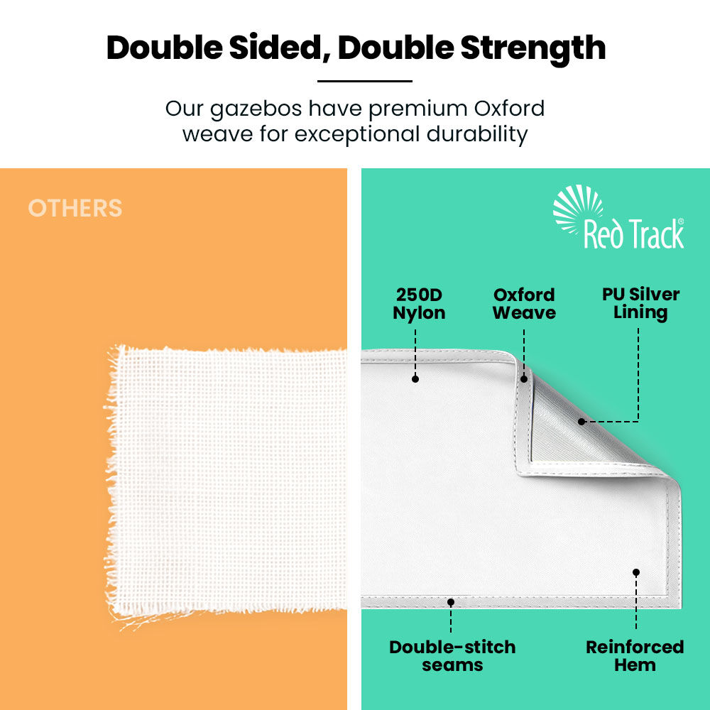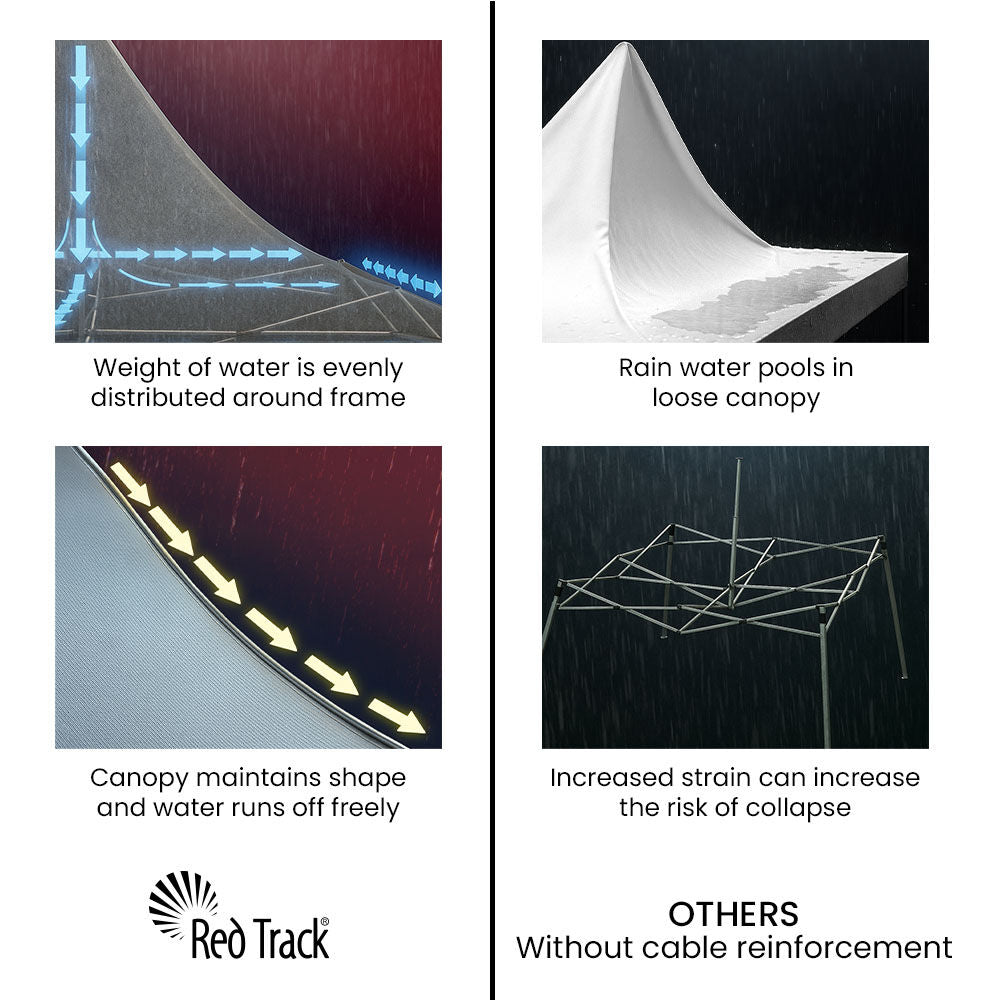 At the heart of the design is Red Track’s patented steel-cable reinforced canopy structure, which keeps the roof tight, prevents water from pooling, and adds exceptional wind resilience. Combined with oversized truss bars and square-tube steel legs, this gazebo offers rigidity you can rely on.
