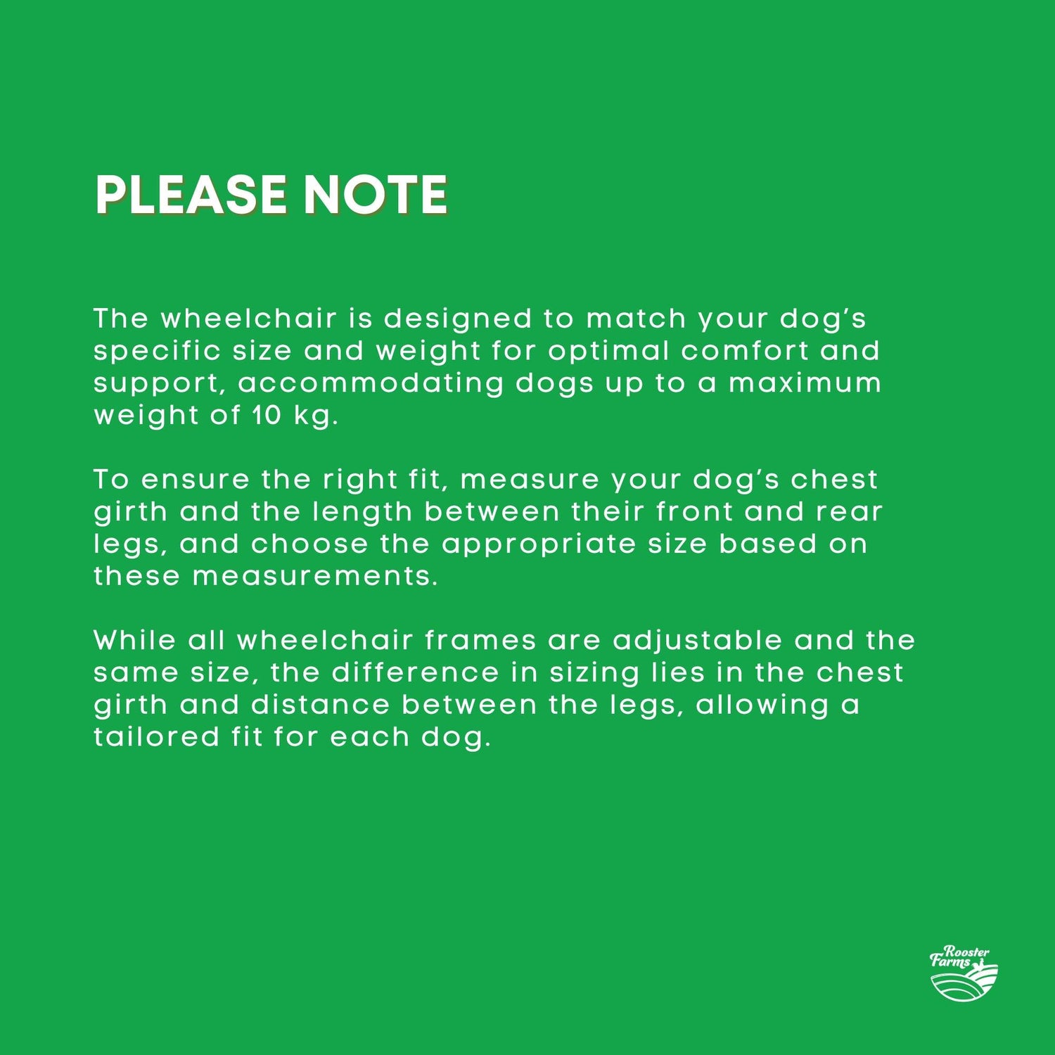 Sizing Note: This wheelchair is specifically designed for small dog breeds up to 10kg. The wheelchair frame remains the same size across all options — what changes is the harness size, which must match your dog’s body measurements.