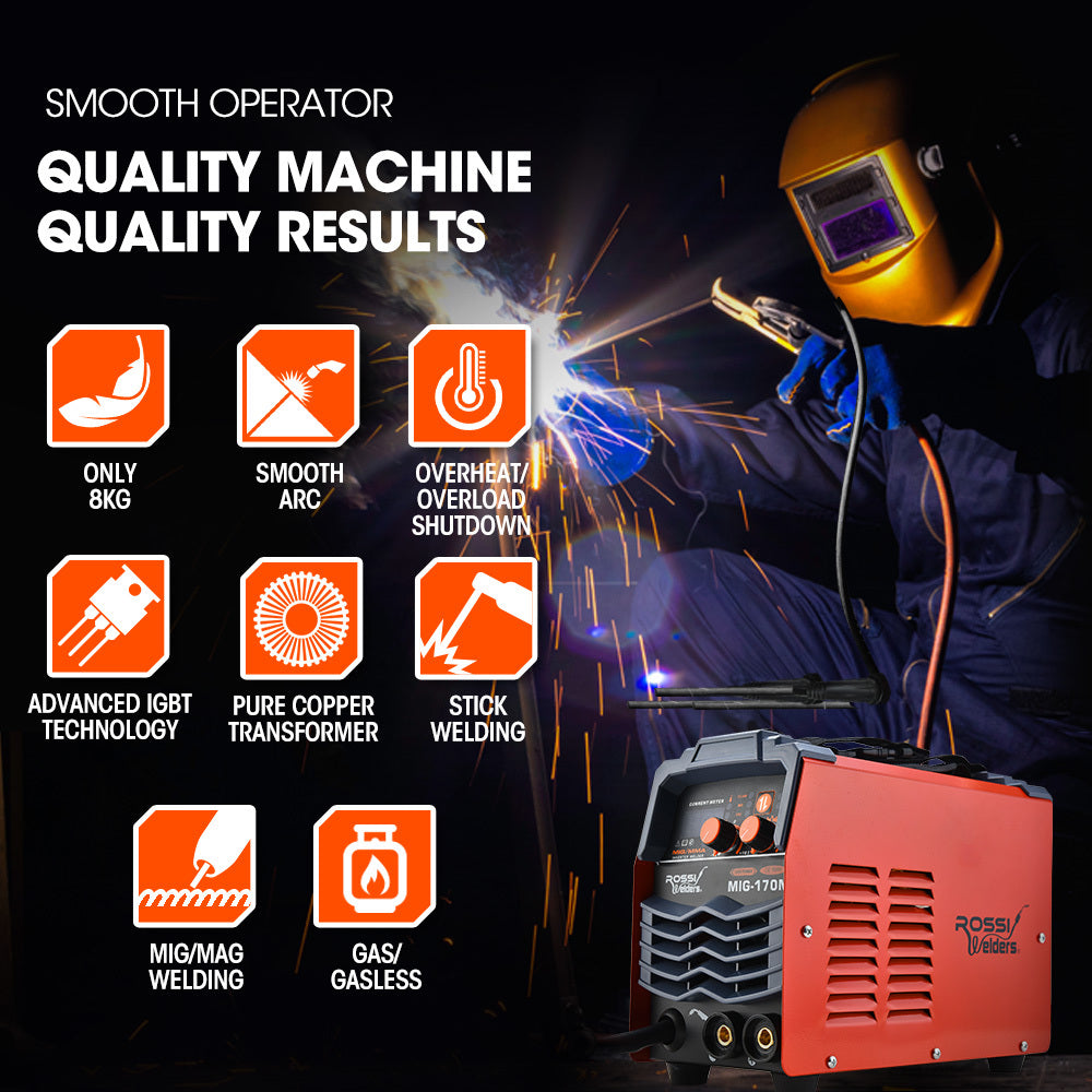 The Rossi MIG-170N - powerful, yet extremely lightweight 170Amp MIG/Stick iGBT inverter welder is a must have for any handyman or serious DIYer. Highly compact and featuring true iGBT DC inverter technology, youre assured an instant start and deep penetration.