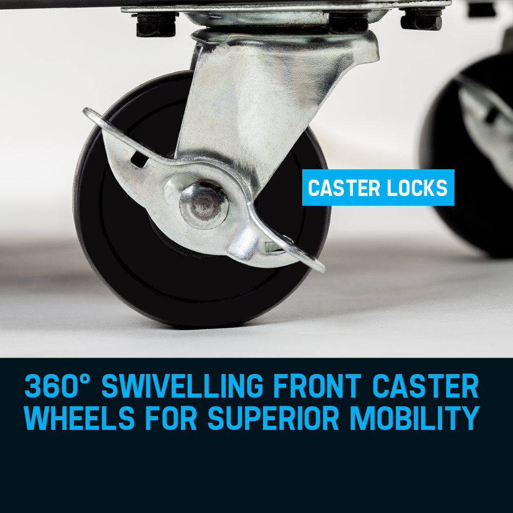 - 360° swivelling front caster wheels with brake for superior mobility