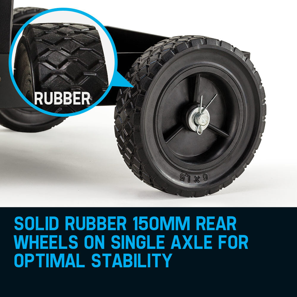- Solid-rubber 6' rear wheels on single axle for optimal stability