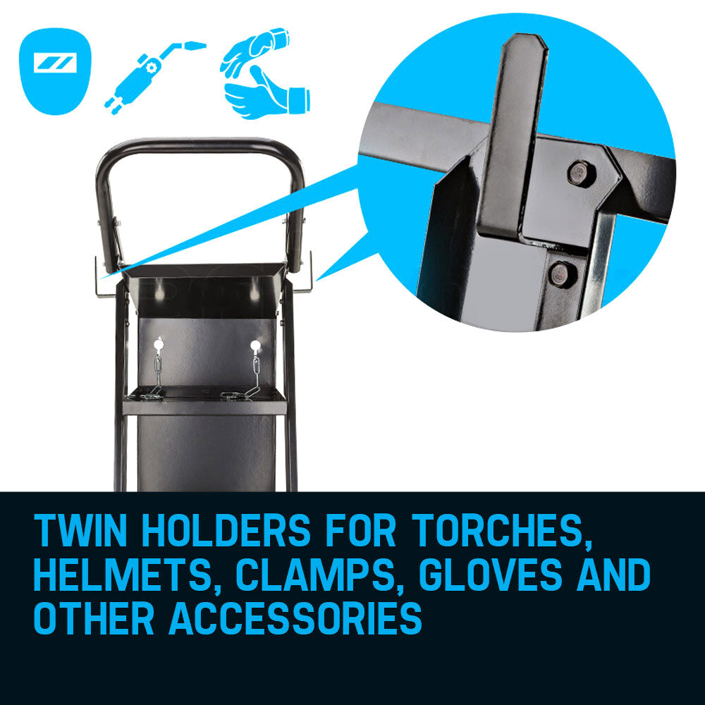 In search of the perfect weld, you should forget all worries behind and steady your hand. The Rossi Deluxe makes sure you can. With plenty of space for the welding unit, wires, rods, mask, tungsten nozzles and everything else that's required for a successful fusion, you can focus entirely on the work at hand. And you can work quickly too thanks to its solid-rubber rear wheels and nimble 360° swivelling front wheels with brake, your Rossi Deluxe is a breeze to move around the workshop.