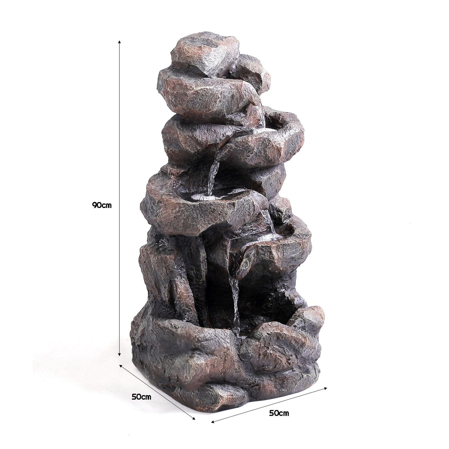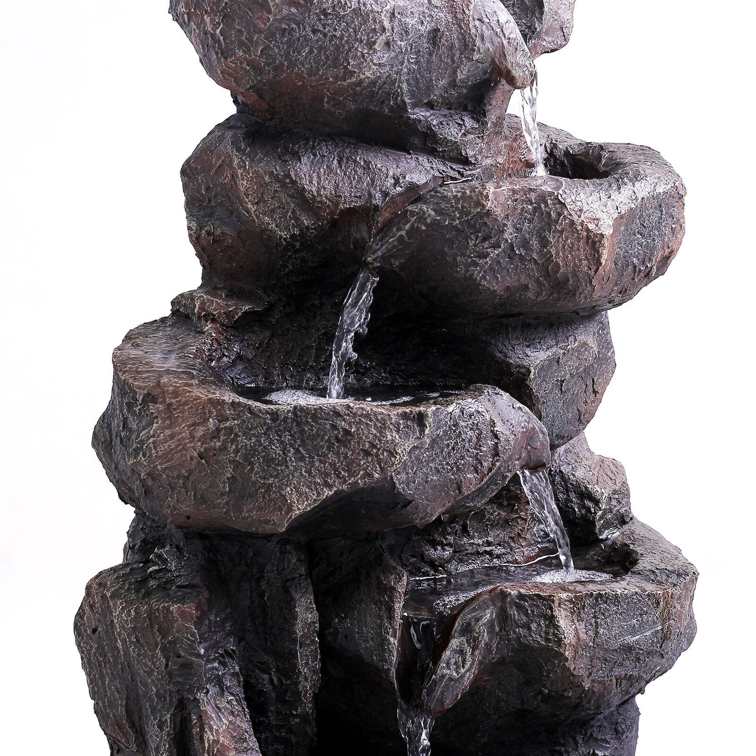 Made of durable yet lightweight polyresin, this fountain has the appearance of natural stone. Plus, you'll love the soothing sound of running water as streams trickle over the rocks. Illuminated by four LED lights, you will be able to enjoy your fountain at any time, day or night. This fountain features a solar powered submersible pump, so you just need to fill the fountain up with water, place the solar panel under sunshine and the fountain is ready to go!