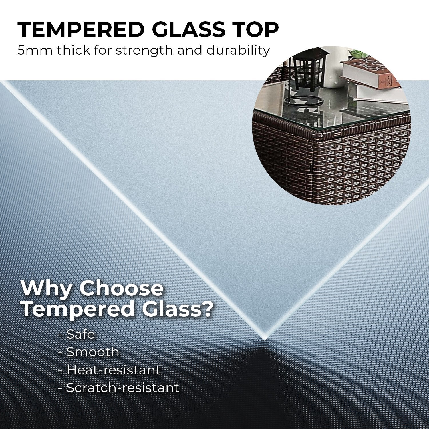 For an added touch of luxury, the coffee table comes with a 5mm thick tempered glass top. Safe and heat-resistant, it's the perfect place to set down your drink while you read or chat.