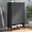 With this shoe cabinet, you can store your shoes effectively and also add practical decor to your home. Durable material: The engineered wood is of exceptional quality with smooth surface and also features strength, stability and resistance to moisture.Ample storage space: The shoe cupboard offers ample storage space to keep your shoes well-organised and offers a clean and clutter-free living area.Sturdy top: The top of the shoe organiser can also be used to display your favourite decorative objects.Practical handle: The shoe stand comes with handles that make it easy to open and close the cabinet while adding extra beauty. Warning:To prevent it from tipping over, this product must be used with the provided wall attachment device.
