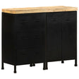 If you're looking for a simple touch of the rustic as well as industrial charm to add to your interior decor, this wooden sideboard will do the trick. The side cabinet is made of rough mango wood, a tropical hardwood with the strength to bear the weight. It also stands the wear and tear of time, making it stable and durable. The powder-coated iron frame also adds extra stability. The cupboard features 2 doors and 3 drawers, providing ample storage space. Additionally, the sturdy wooden top is ideal for displaying decorative objects such as photo frames, potted plants, vases, etc. Important note: Colours and grains may vary from piece to piece, making each piece unique. The delivery is random, ensuring the exclusivity and individuality of your product.