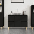 This sink cabinet is meant to be a great addition to your bathroom, giving it a tidy and striking appearance! Durable material: The engineered wood is of exceptional quality with smooth surface and also features strength, stability, and resistance to moisture.Ample storage space: The bathroom sink cabinet has 4 drawers and 1 compartment with a door, offering various storage options and extra space to store items in your bathroom. The top of the bathroom cabinet is ideal for placing the sink.Wooden feet: The solid eucalyptus wood feet give the under sink cabinet a natural and pleasant look while ensuring stability.Easy-to-clean surface: The bathroom furniture is easy to clean with a damp cloth. Warning:To prevent it being overturned, this product must be used with the provided wall attachment device. Good to know:To make assembly as easy as possible, each product is delivered with a manual.The sink is not included.