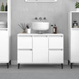 This sink cabinet is meant to be a great addition to your bathroom, giving it a tidy and striking appearance! Durable material: The engineered wood is of exceptional quality with smooth surface and also features strength, stability, and resistance to moisture.Ample storage space: The bathroom sink cabinet has 4 drawers and 1 compartment with a door, offering various storage options and extra space to store items in your bathroom. The top of the bathroom cabinet is ideal for placing the sink.Metal feet: The metal feet add a modern and calm style to your interior while ensuring stability.Easy-to-clean surface: The bathroom furniture is easy to clean with a damp cloth. Warning:To prevent it being overturned, this product must be used with the provided wall attachment device. Good to know:To make assembly as easy as possible, each product is delivered with a manual.The sink is not included.