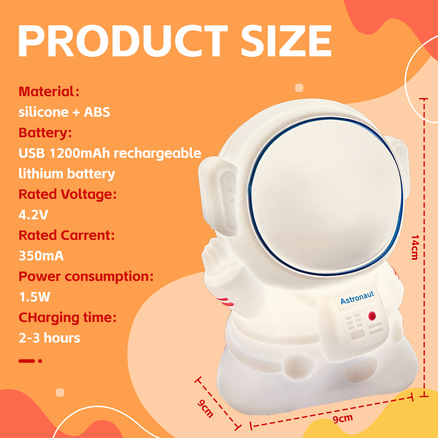 This astronaut-shaped night light combines soft ambient lighting with playful design, making it perfect for children’s rooms, nurseries, or late-night reading. Crafted from durable silicone + ABS materials, it provides a gentle, soothing glow that helps reduce nighttime anxiety and promotes peaceful sleep.