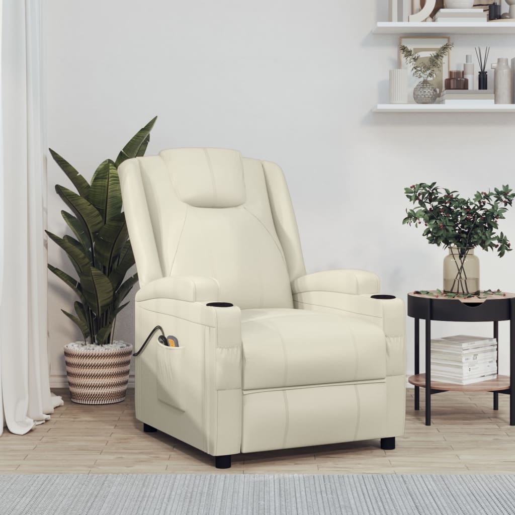 Sit back and drift away in this highly comfortable stand up massage chair! Manual reclining function: The reclining chair is specially designed with 3 reclining positions so that you can adjust the backrest and footrest manually as per your comfort.Power lift function: This recliner chair for the elderly is equipped with an electric motor for the lifting function. Thanks to the function that pushes the entire chair up, you can easily stand without stressing your back and knees with the 2-button hand control.Vibration function: The featured 6 massage points let you experience a better-targeted massage. Additionally, the included hand control allows you to pick different massage programs. The massage function is powered by the USB connector, but the certified 5V USB power source is not included.Comfortable seat experience: The thickly padded seat, backrest, and wide armrests covered in faux leather provide a cosy and warm sensation, making you feel embraced while seated. The faux leather is a highly durable material. It is resistant to stain, making it easy to clean with a damp cloth. The smooth surface also gives a luxurious look and the beauty of real leather.Solid and stable frame: The frame made of wood and metal provides a strong structure and stability. This reclining armchair is comfortable and durable.