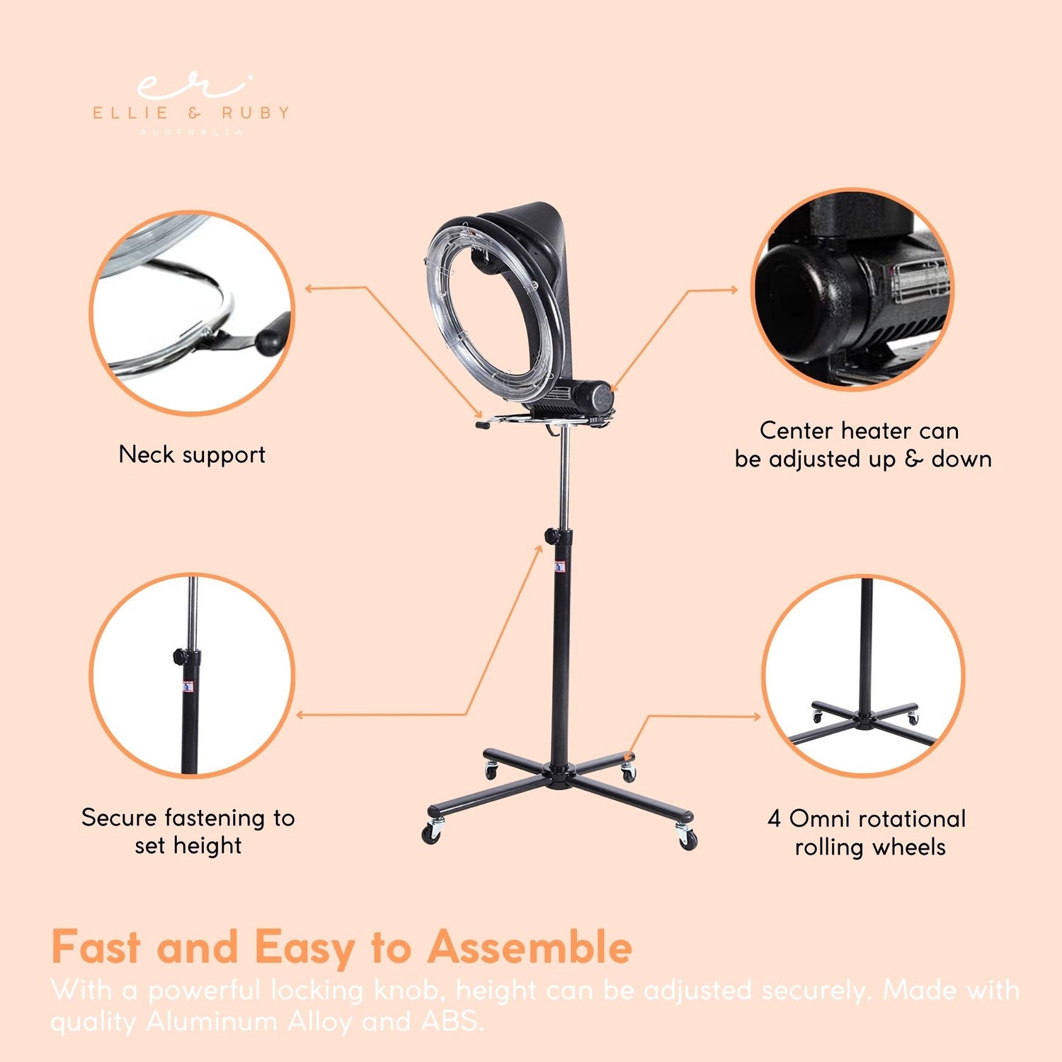 The machine is easy to move around the salon, with it's omnirotional pedestal smooth rolling wheels. It also has a 360˚ halo heating wire head so that the hair receives all round and even care.