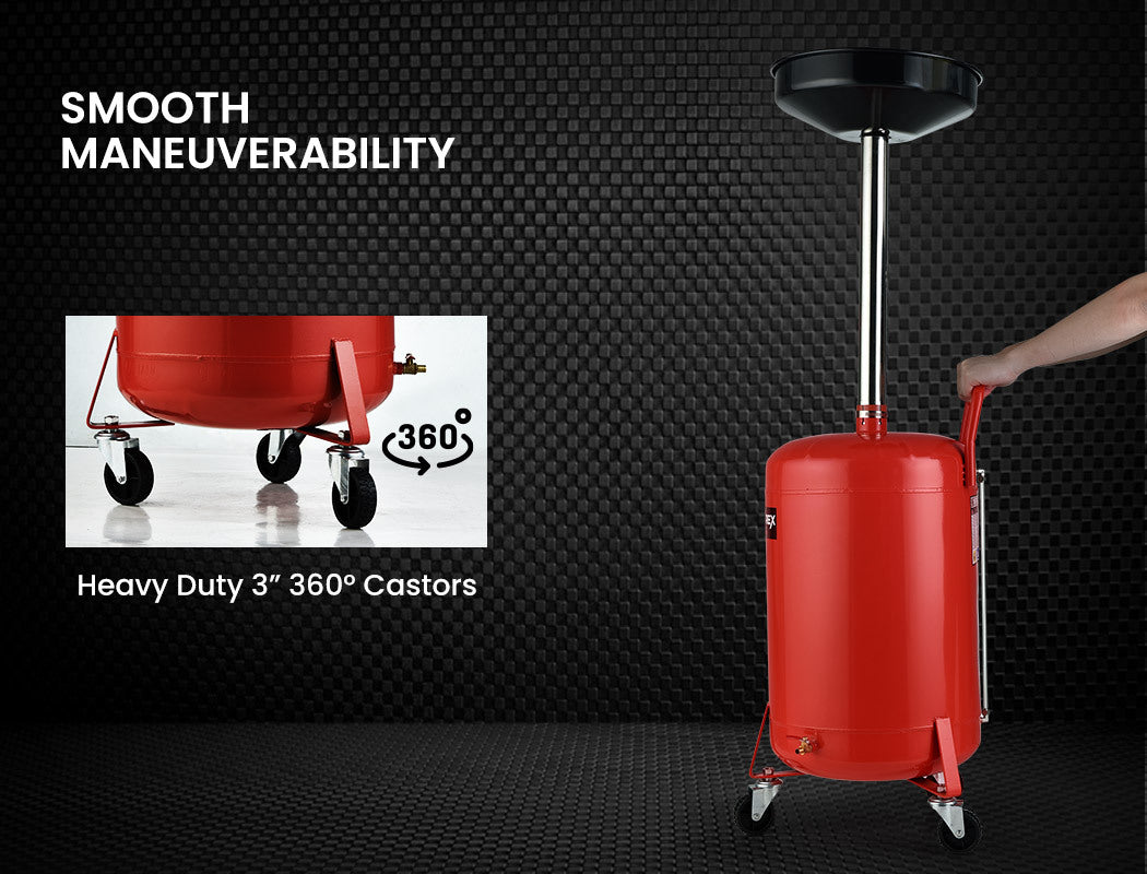 The portable unit manoeuvres on three 3 inch 360° swivelling castors for smooth and quiet mobility over shop floors. A built-in oil level indicator allows you to easily keep track of your tank capacity.