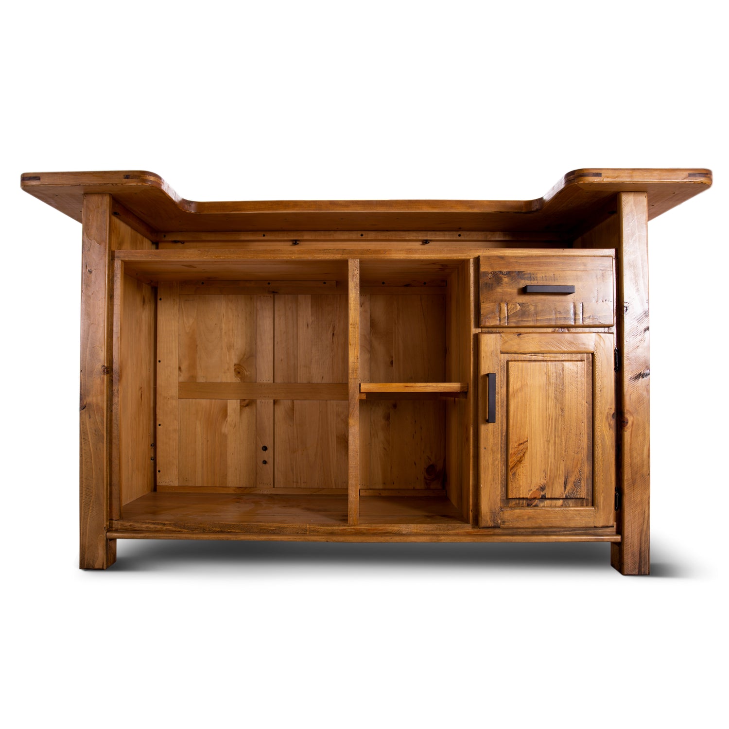 This wooden bar table is just perfect for the living area, creating the perfect ambience for beautiful evenings. It comes with a spacious top and features 1 door, covering a roomy compartment, 1 sizable drawer, and 1 large niche. It has plenty of storage space in its drawer and door. The door and drawer have strong metal handles. The bar designed in the modern rustic style gives a classic look to your bar space. The bar's rustic oak finish complements almost any interior decor setting. The bar is made of solid pine wood, harvested in a sustainable manner. The wood is well-known for its aesthetically pleasing appearance, strength, and durability. A one-year warranty is included with the easy-to-assemble bar table.