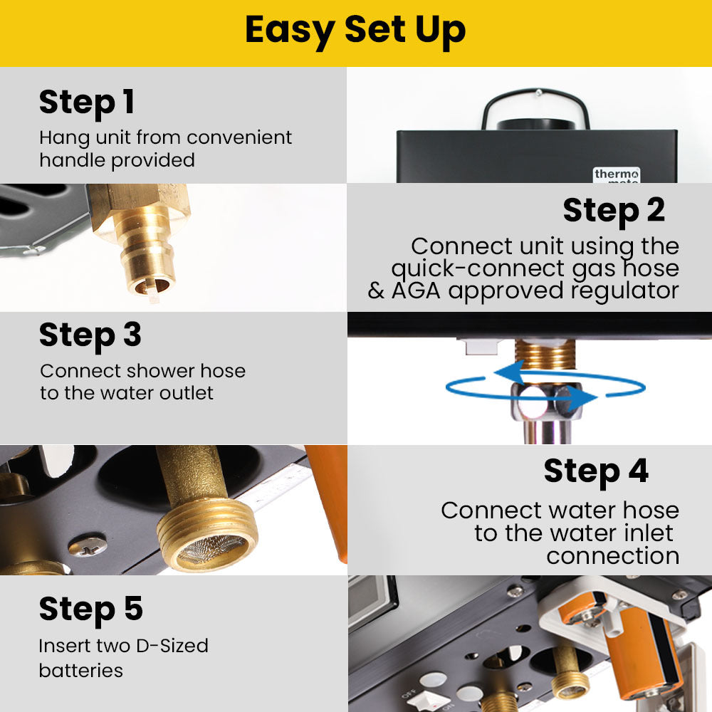 The Thermomate Tankless Outdoor Water Heater delivers endless hot water with optimal efficiency! No electricity is required, making this compact unit ideal for a hot shower when camping or caravaning, or for washing livestock or pets on a remote property.