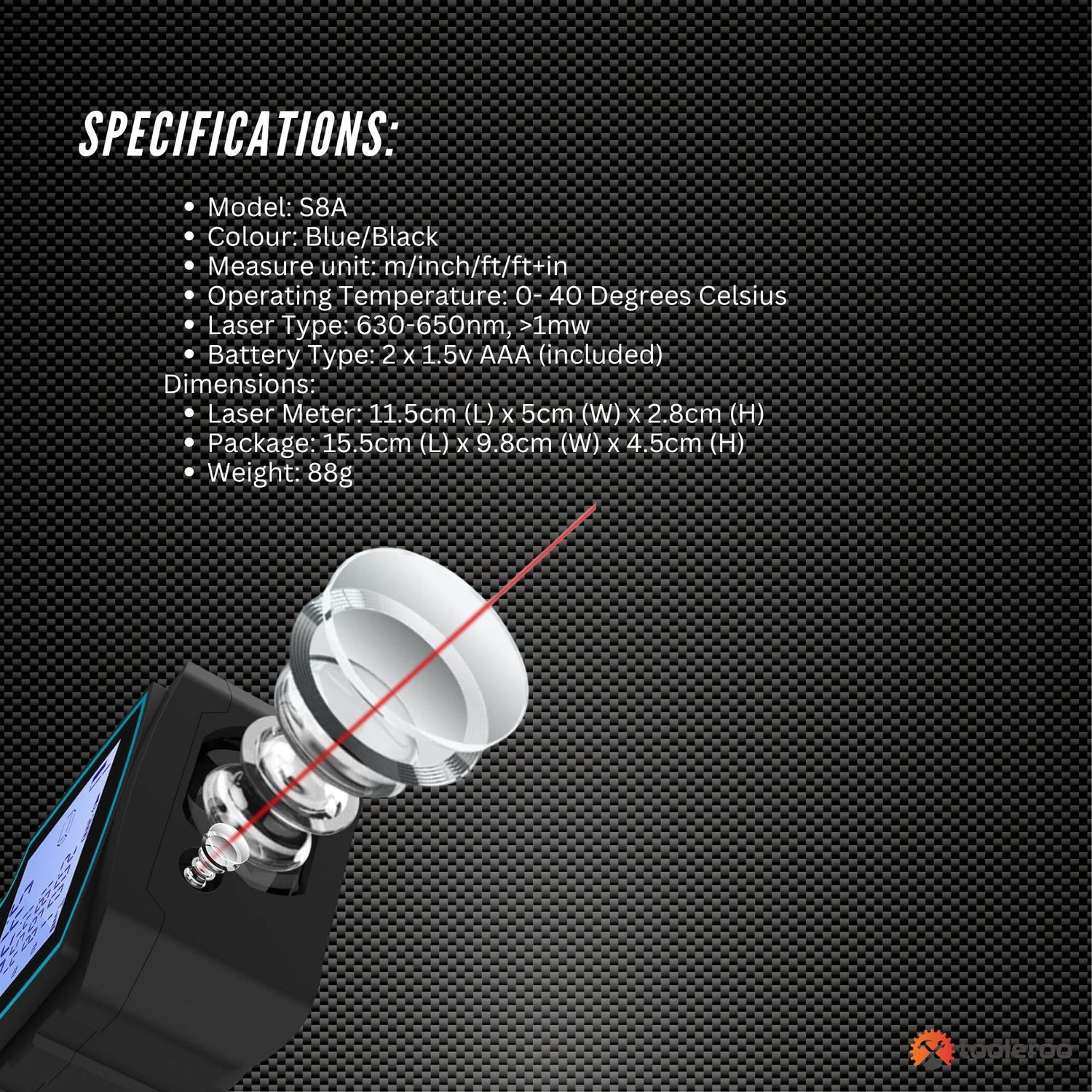 Measure with precision and speed using the S8A Laser Distance Measurer. Designed for DIYers, builders, and professionals alike, this compact tool delivers highly accurate readings in metres, feet, inches, or a combination of units. It features two integrated bubble levels for enhanced accuracy when measuring on uneven surfaces. With built-in memory storage, area and volume calculation functions, plus both single and continuous measurement modes, the S8A is a reliable, all-in-one solution for your measuring needs.