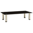 This contemporary TV stand with tempered glass construction adds a modern touch to your living room and bedroom. This TV table is made of thick tempered glass and heavy-durable stainless steel, making it exceedingly sturdy and safe. The strong tabletop can be used for placing television, laptop and other multimedia devices. You can also put your drinks, vases and other small items on the TV stand. Additionally, the smooth surface is easy to clean with only a damp cloth.