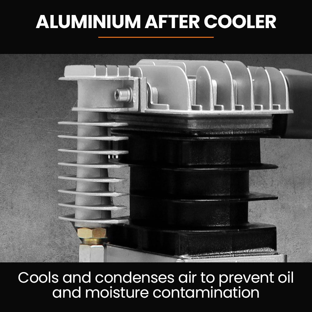 The heart of this machine is a robust cast iron parallel twin-cylinder compressor with aluminium pistons. The aluminium after-cooler is assisted by a fan integrated into the drive pulley. The cooler air output contributes to the compressor's overall efficiency and performance. The aftercooler helps ensure that less moisture ends up in your air hose protecting your tools from damaging moisture. The unit also features a pump speed of 950 rpm and a duty cycle of 0.75, ensuring consistent and reliable performance. The pump has an outstanding air displacement of 370L/Min (13.0 CFM), giving it powerful air delivery for demanding applications.