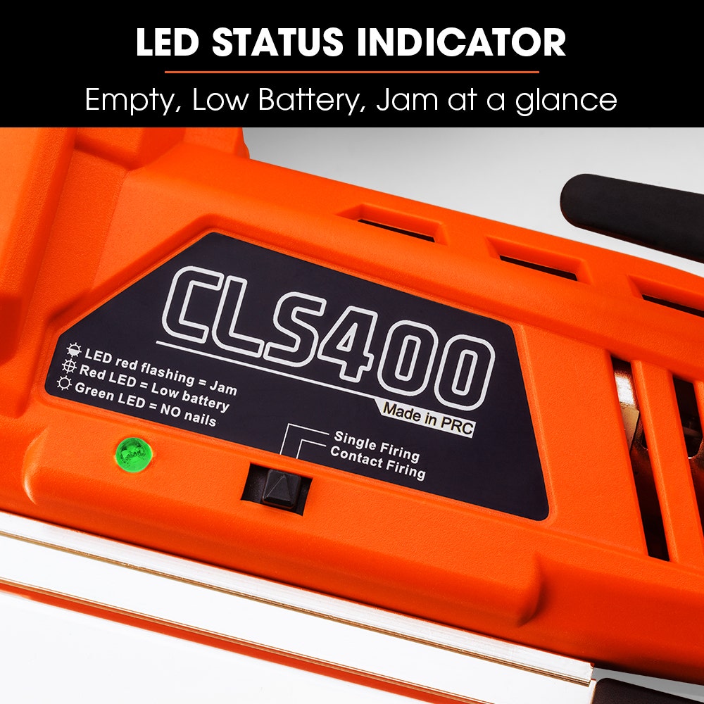 For enhanced precision, the CLS400 includes a depth-of-drive dial and a No-Mar contact tip to prevent surface damage. Dual LED work lights brighten low-light areas, and an LED indicator alerts you to jams, empty loads, or low battery status.