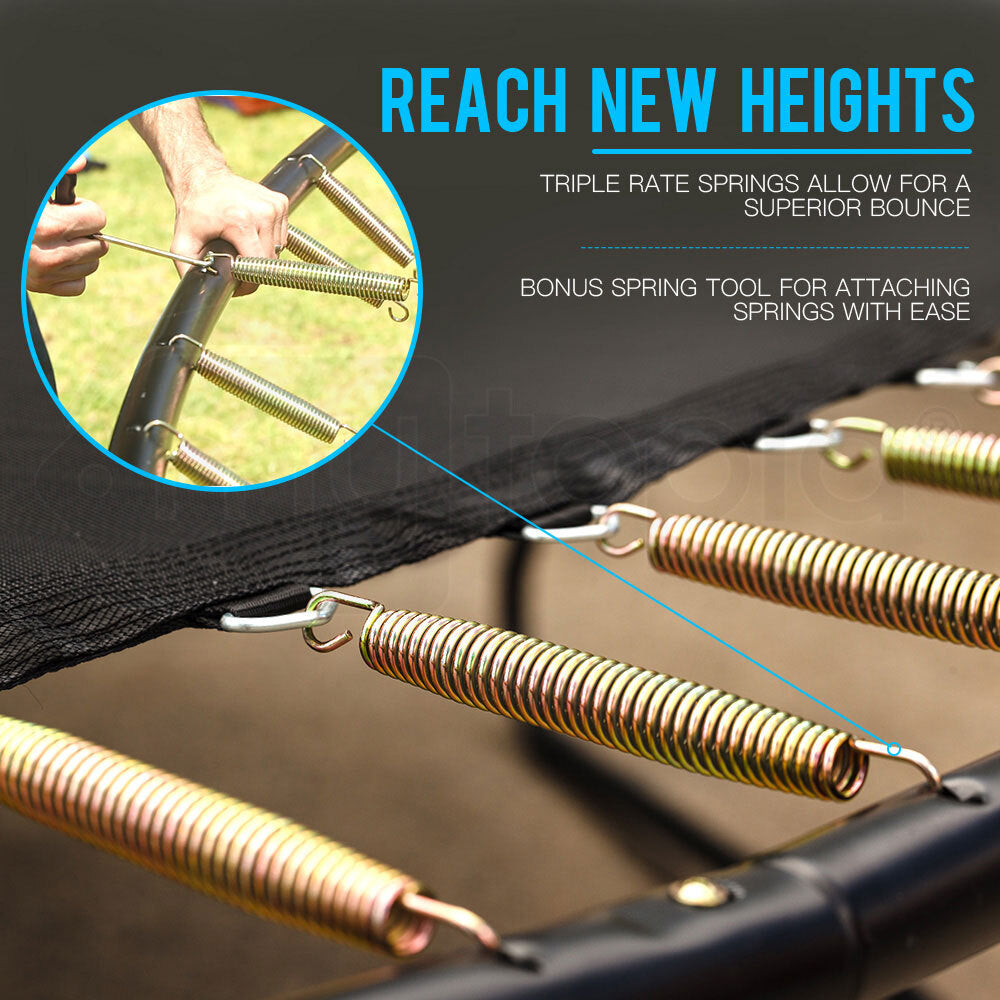 Triple-rate springs, strong rigid frame, curved safety poles, enclosure safety net, safety pads and quality mat create a perfect balance between safety and excitement! This 10ft Trampoline is perfect for jumpers of all ages and normal-sized backyards.