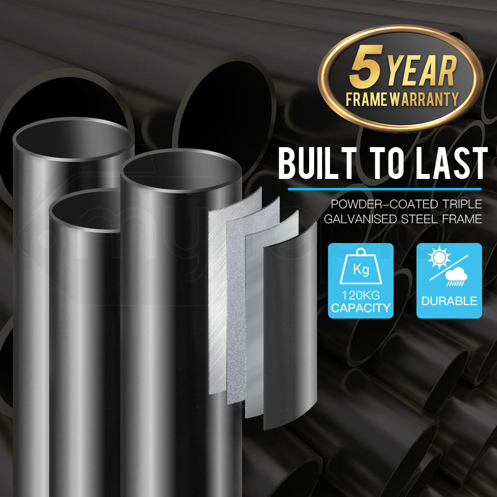- Steel Frame Coating: Marine grade hot dip galvanised (inside out), rust-proof