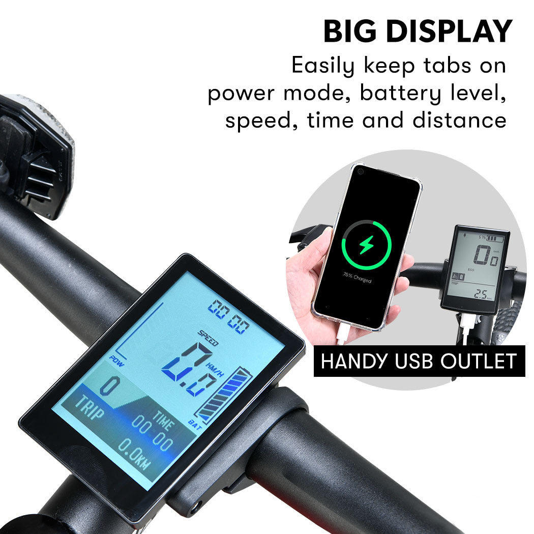 - LCD Display: Speed, Power Assistance Level, Distance, Battery Charge