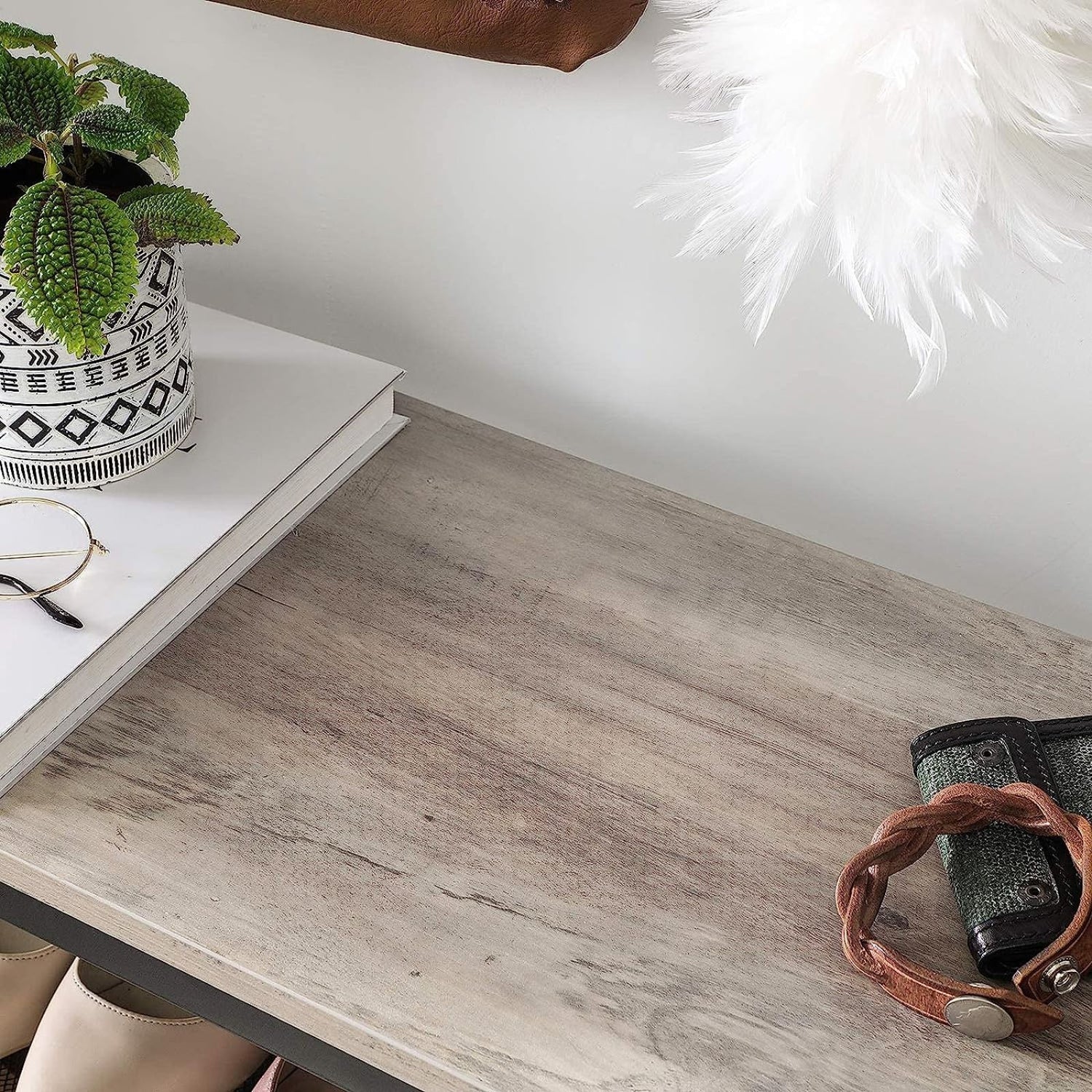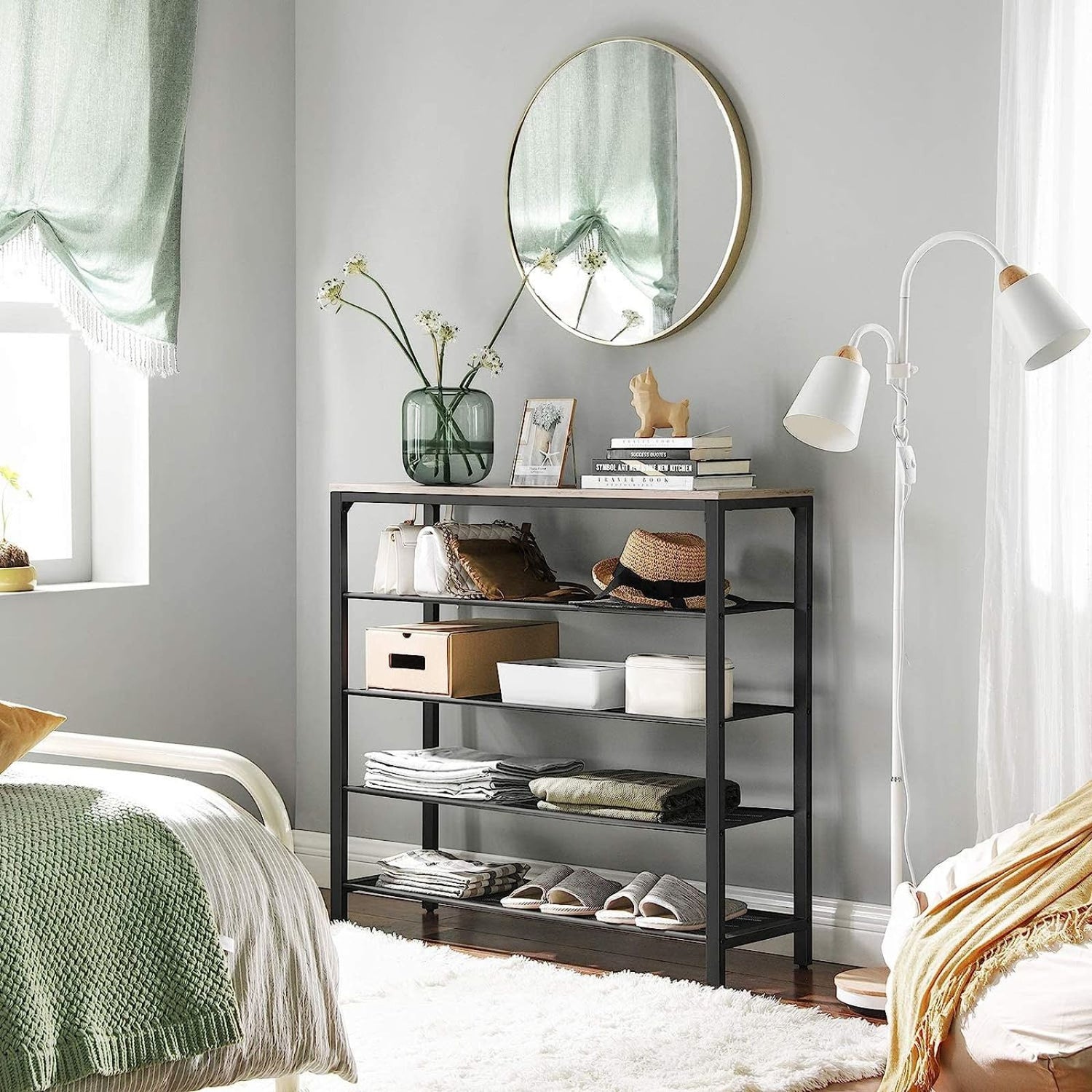 - Add Some Rustic Flair: Whether in the room or in the hallway, the shoe rack with a greige top adds a warm touch.