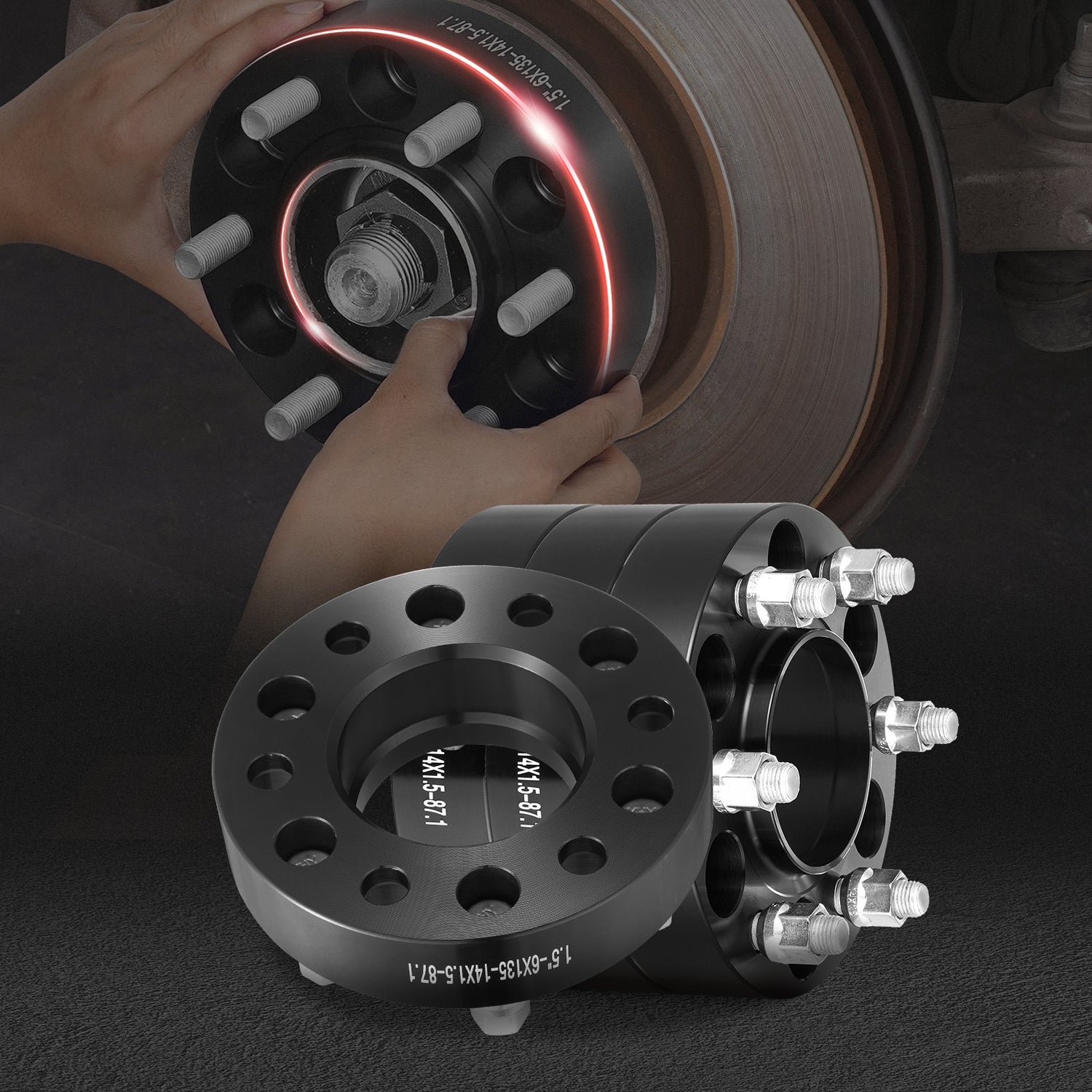 Our wheel adapters includes 4 wheel spacers, each with a thickness of 1.5 inches (38.1mm), a bolt pattern of 6x5.5 inches, a hub bore of 3.43'' (87.1mm), and a thread pitch of M14x1.5. Please carefully check your vehicle's manual specifications before purchasing to ensure compatibility.