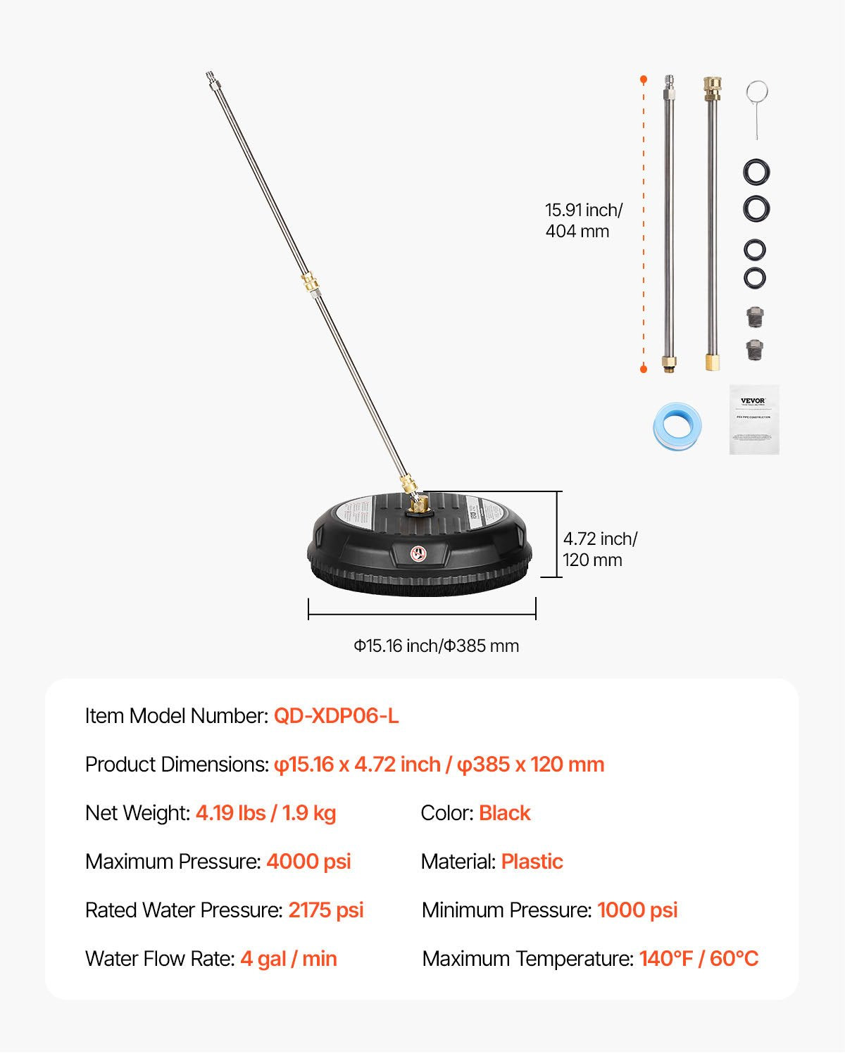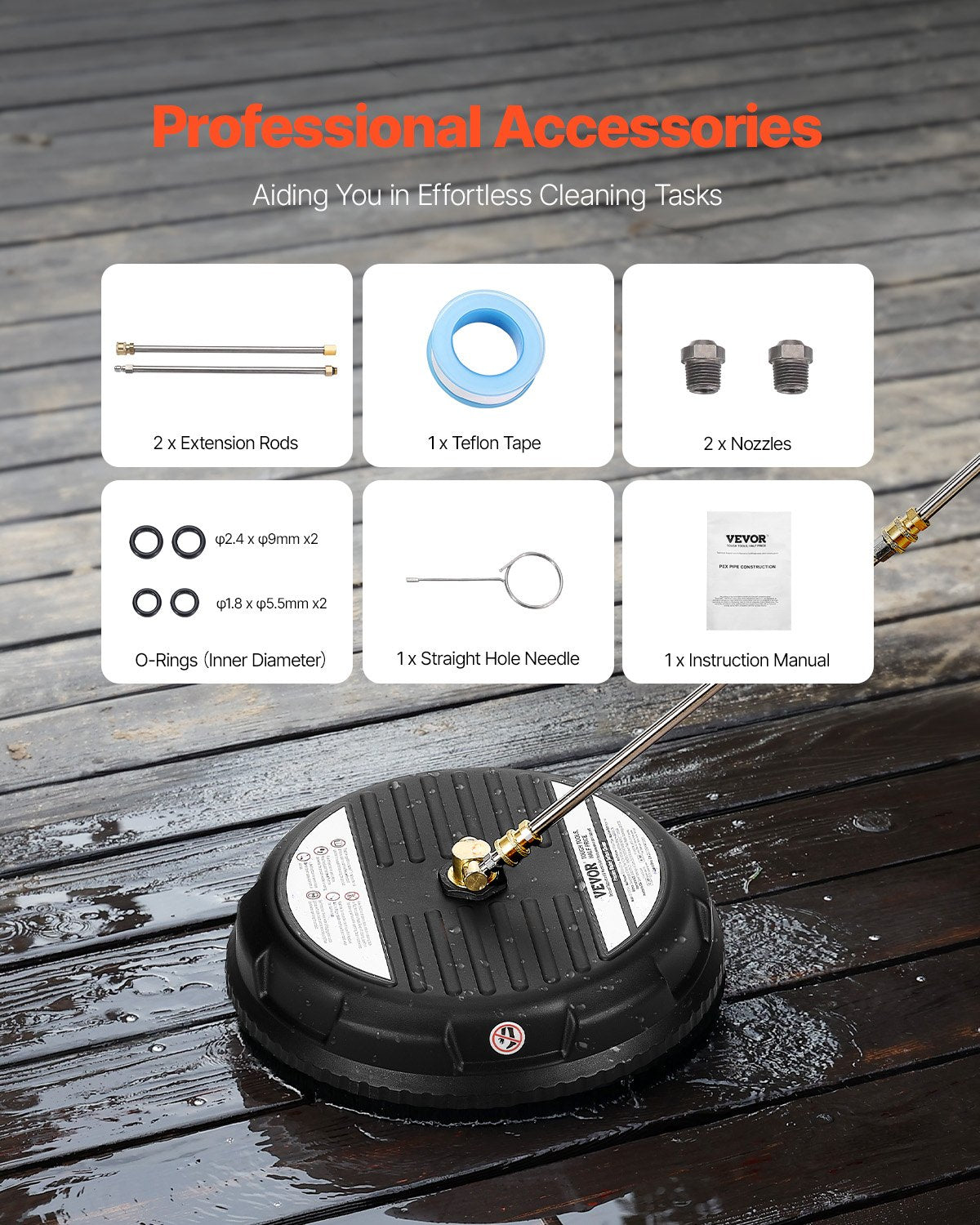 VEVOR 15" Pressure Washer Surface Cleaner 4000 Max PSI Plastic 2 Extended Wands