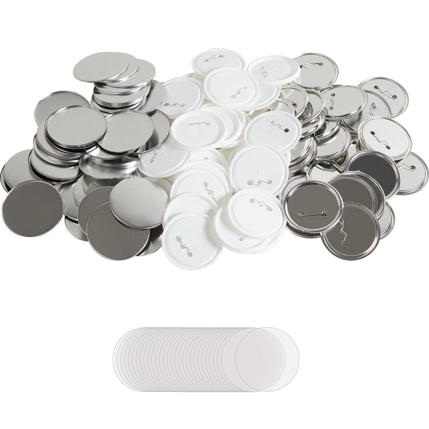 You will get 200 sets of pinback button parts to make 200 pretty button badges, including 200 pcs transparent films, 200 pcs metal covers, 100 pcs metal bottom parts, 100 pcs plastic bottom parts, and 2 washes. The number of all parts is the same. In addition, different metal and plastic bottom parts can satisfy your different needs.